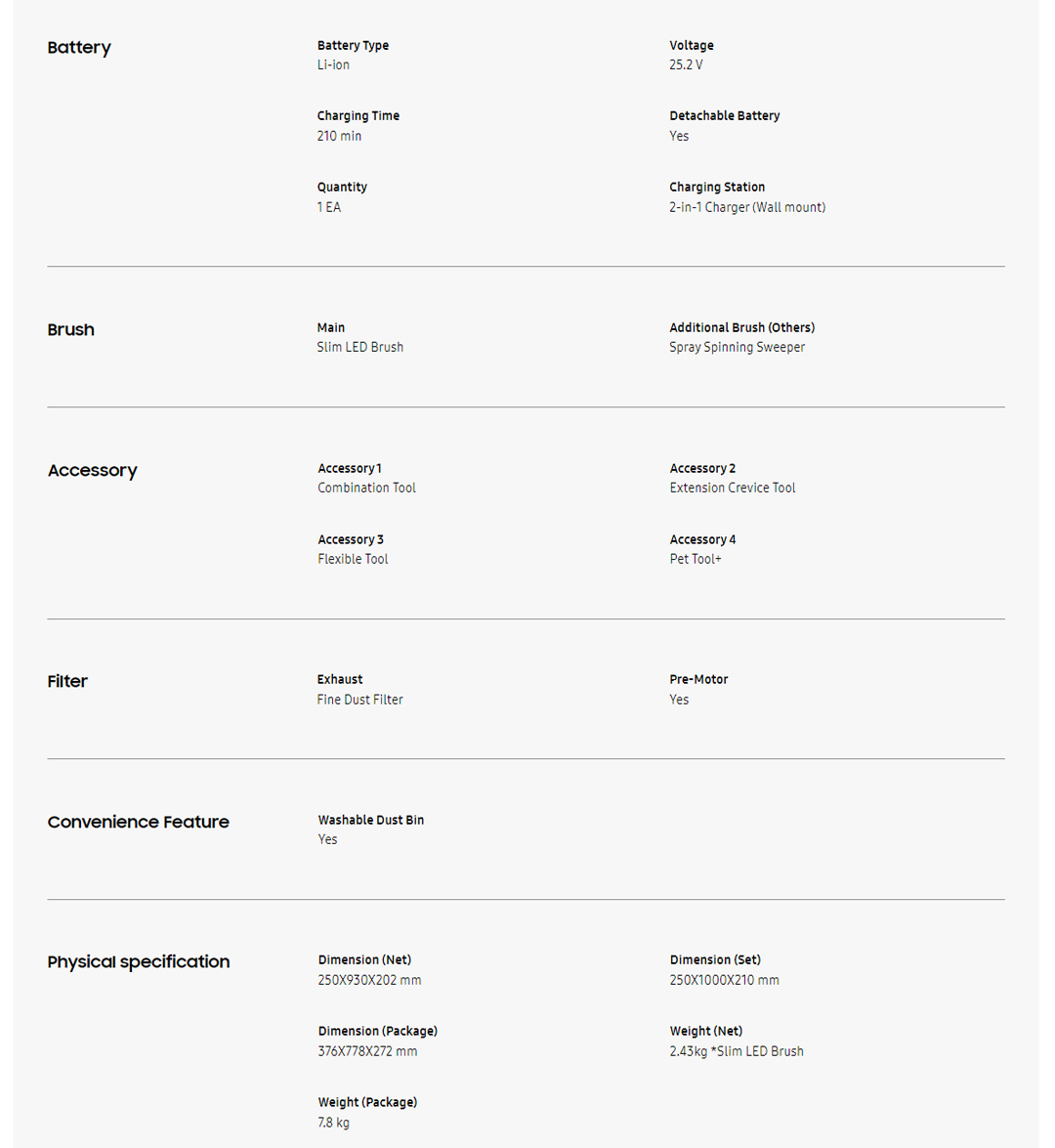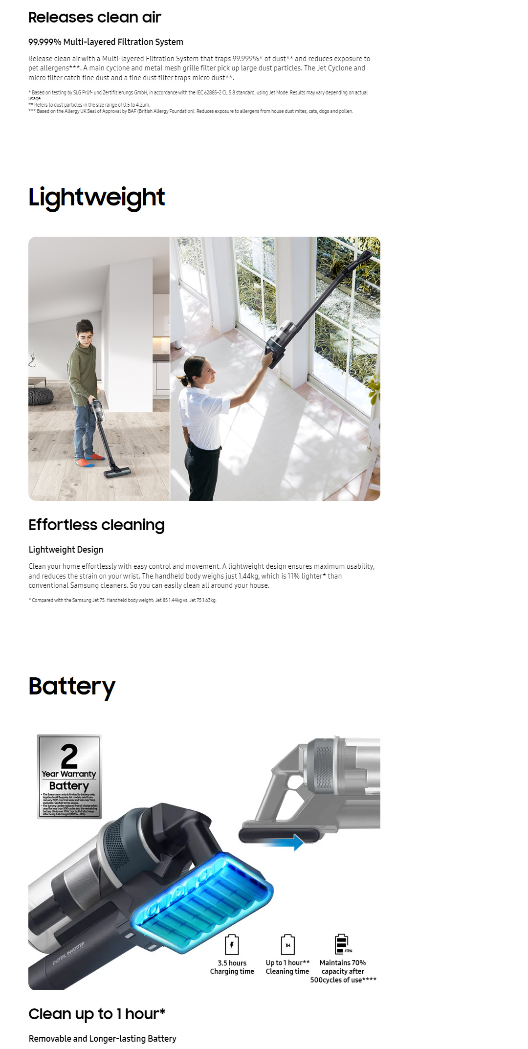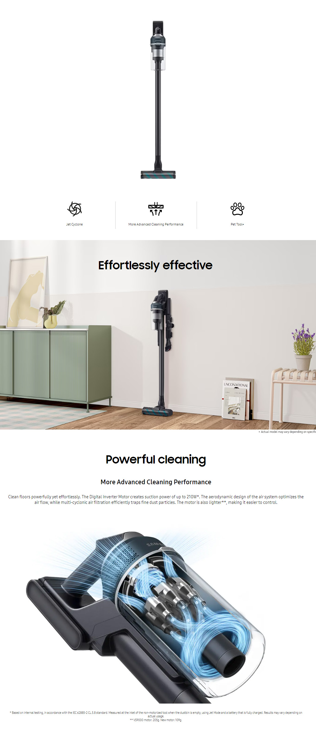SAMSUNG 210W Jet 85 Premium Digital Inverter Motor Vacuum Cleaner Stick VS20C852FTB/ME | 210 W Suction Power | Jet Cyclone | More Advanced Cleaning Performance | Clean Up to 1 hour | Vacuum Cleaner with 2 Years Warranty