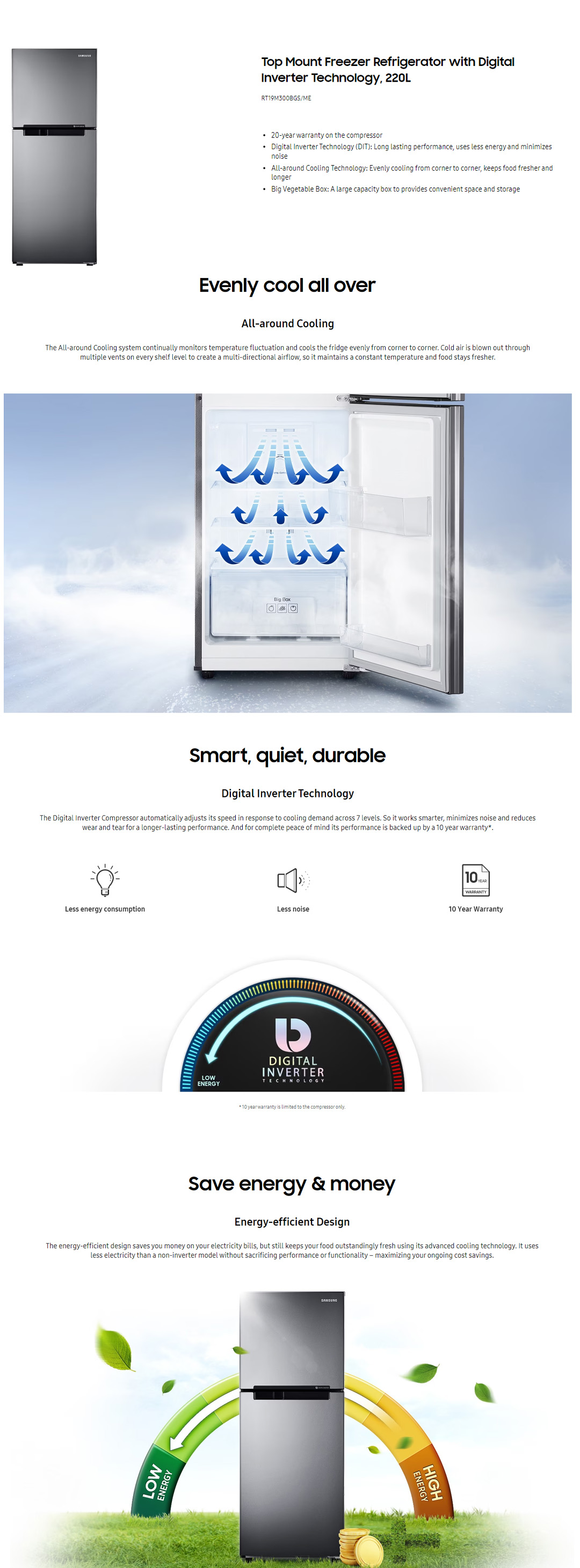 SAMSUNG 220L 2 Doors Top Mount Digital Inverter Refrigerator RT19M300BGS/ME | All-Around Cooling | Less Energy Consumption | Less Noise | No Frost | Refrigerator with 1 Year Warranty