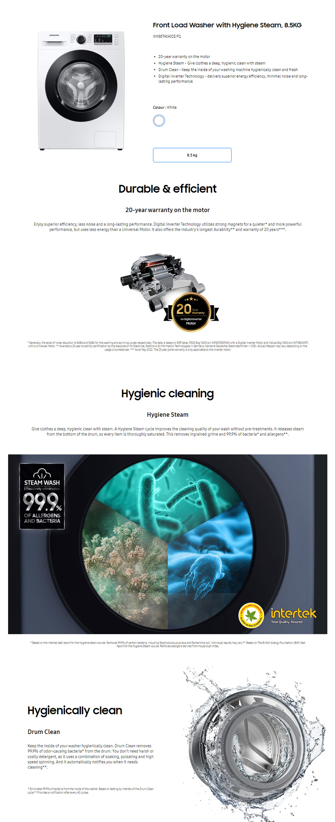 SAMSUNG 8.5KG Front Load Digital Inverter Washing Machine with Hygiene Steam WW85T4040CE/FQ | Drum Clean | StayClean Drawer | Child Lock | Door Lock | Washing Machine with 1 Year Warranty