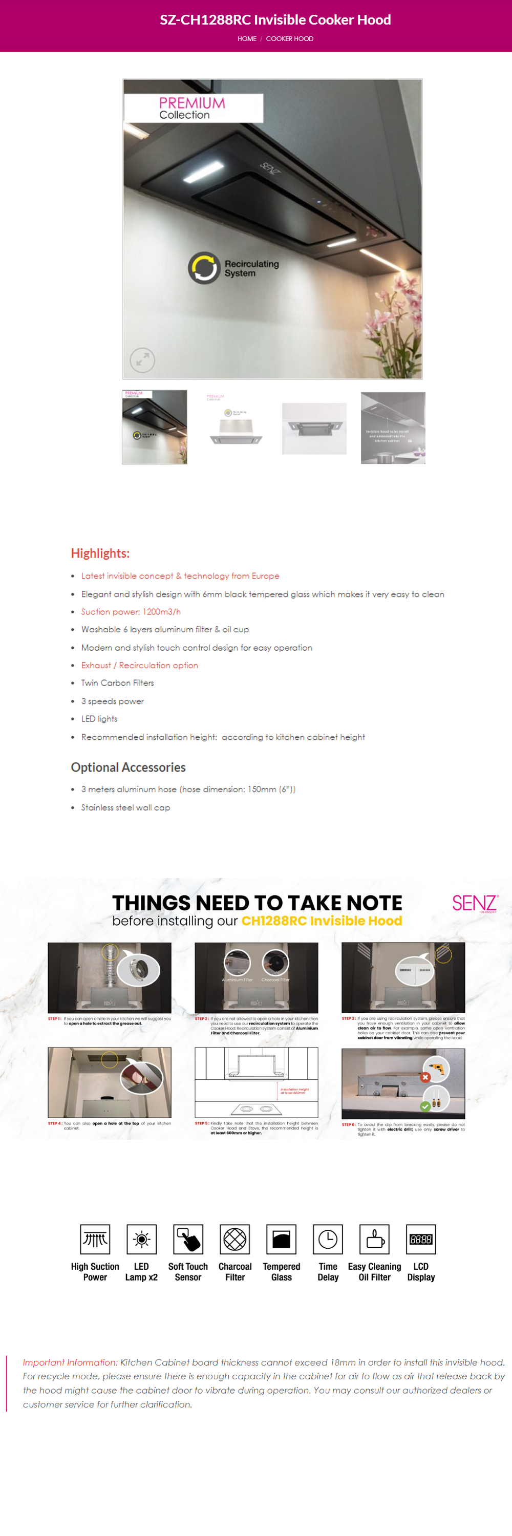 SENZ 1200m3/h Invisible Cooker Hood SZ-CH1288RC | 3 speeds power | Twin Carbon Filters | LED lights
