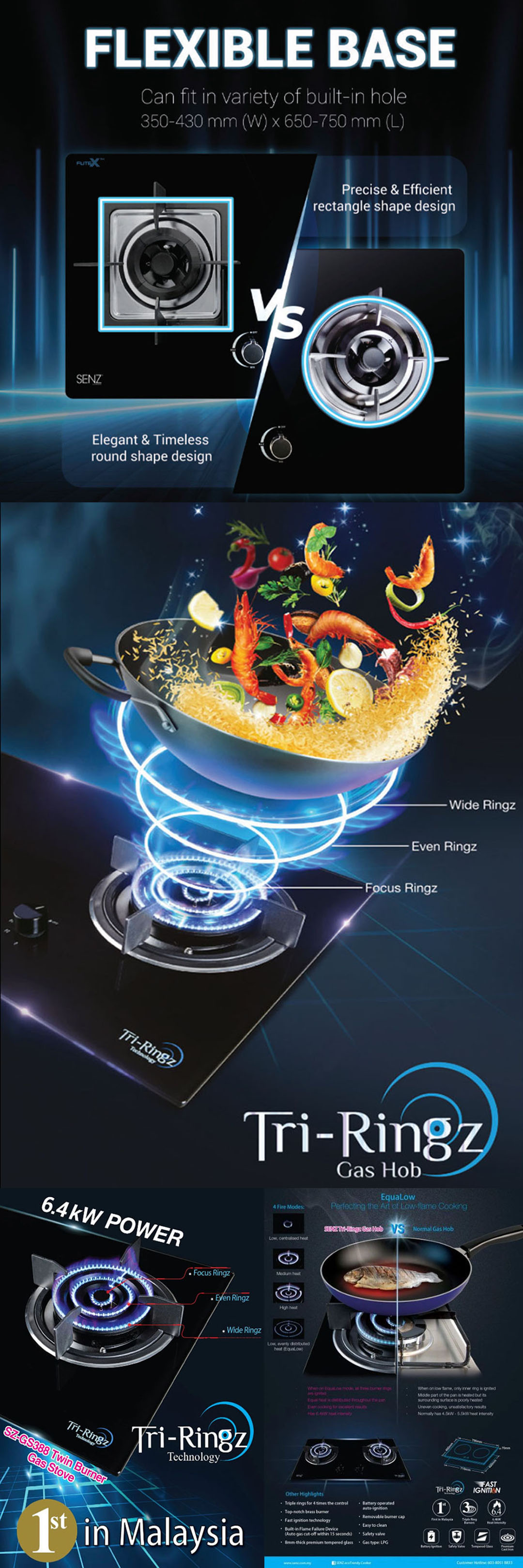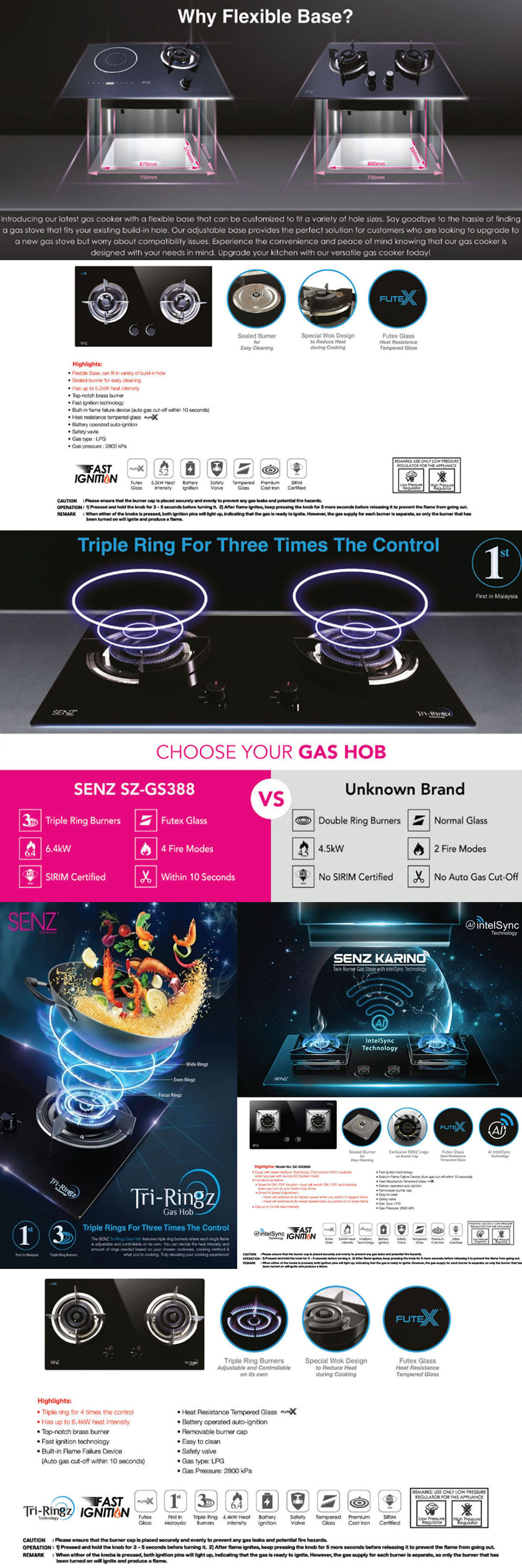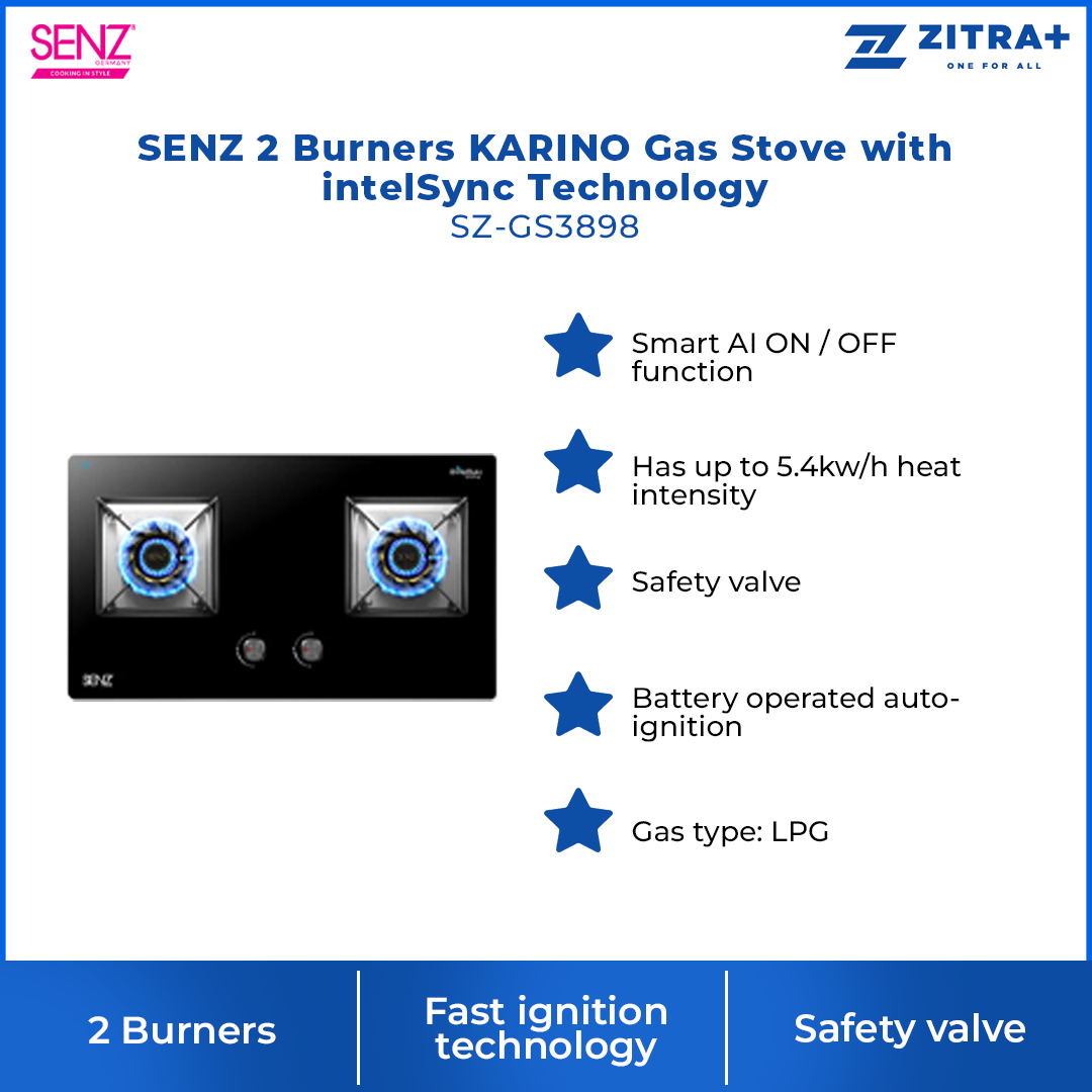 SENZ 2 Burners Gas Stove SZ-GS368FL / SZ-GS388 / SZ-GS3898 / SZ-GS6852FL / SZ-GS980FL | Battery operated auto-ignition | High quality tempered glass | Safety valve | Gas Stove with 1 Year Warranty