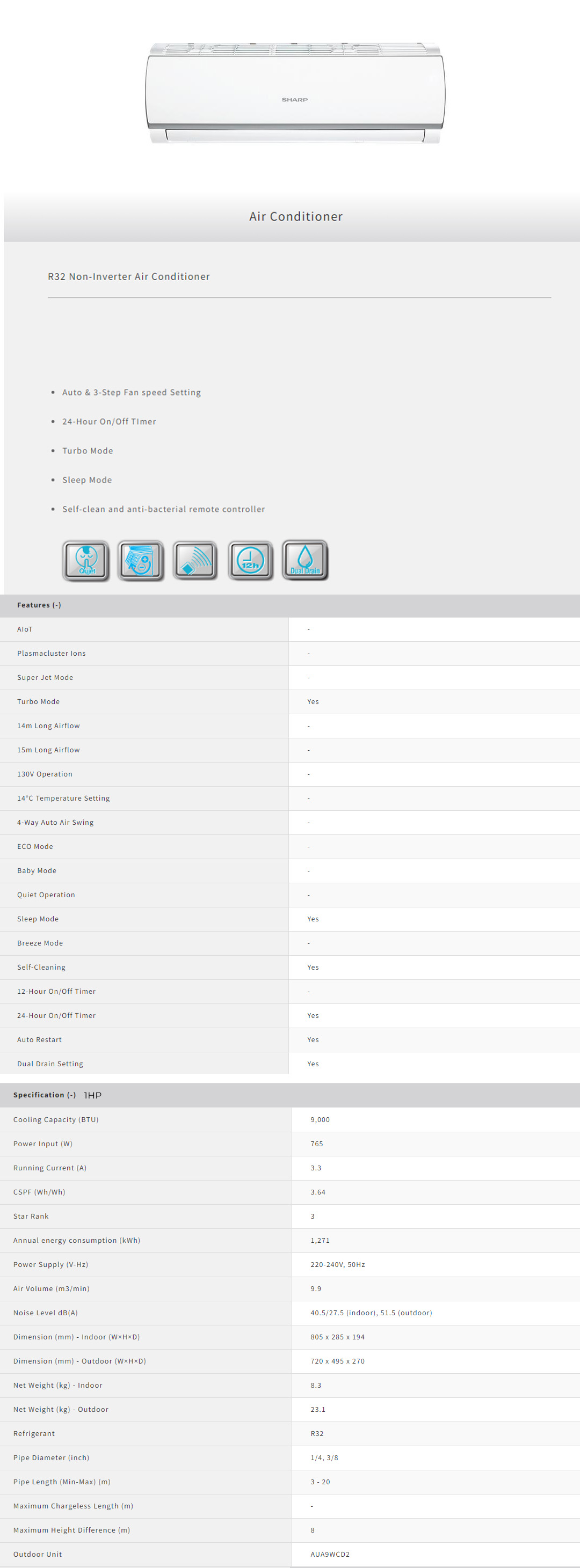 SHARP 1.0HP/1.5HP/2.0HP/2.5HP R32 Non-Inverter Wall Mount Air Conditioner | Auto & 3-Step Fan speed Setting | 24-Hour On/Off Timer | Turbo Mode | Sleep Mode | Air Conditioners with 1 Year Warranty
