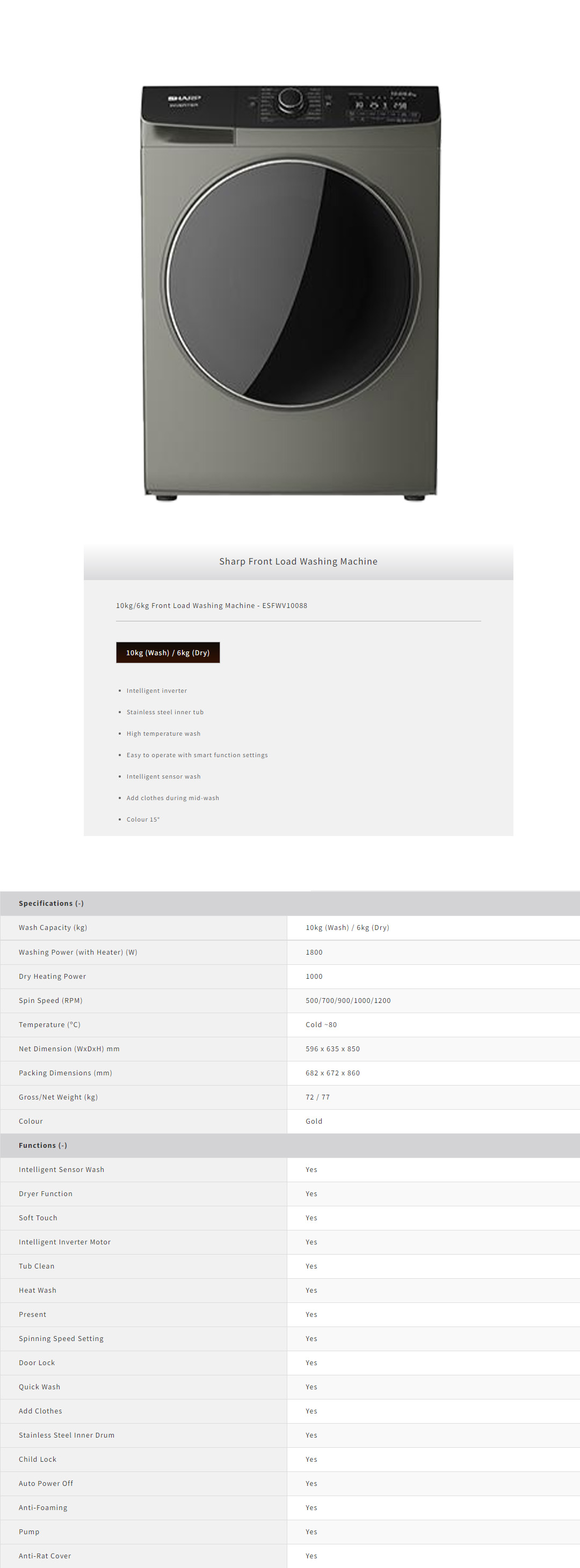 SHARP 10KG/6KG Front Load Intelligent Inverter Washer Dryer Gold ESFWV10088 | Quick Wash | Child Lock | Heat Wash | Tub Clean | Washer Dryer with 2 Year Warranty
