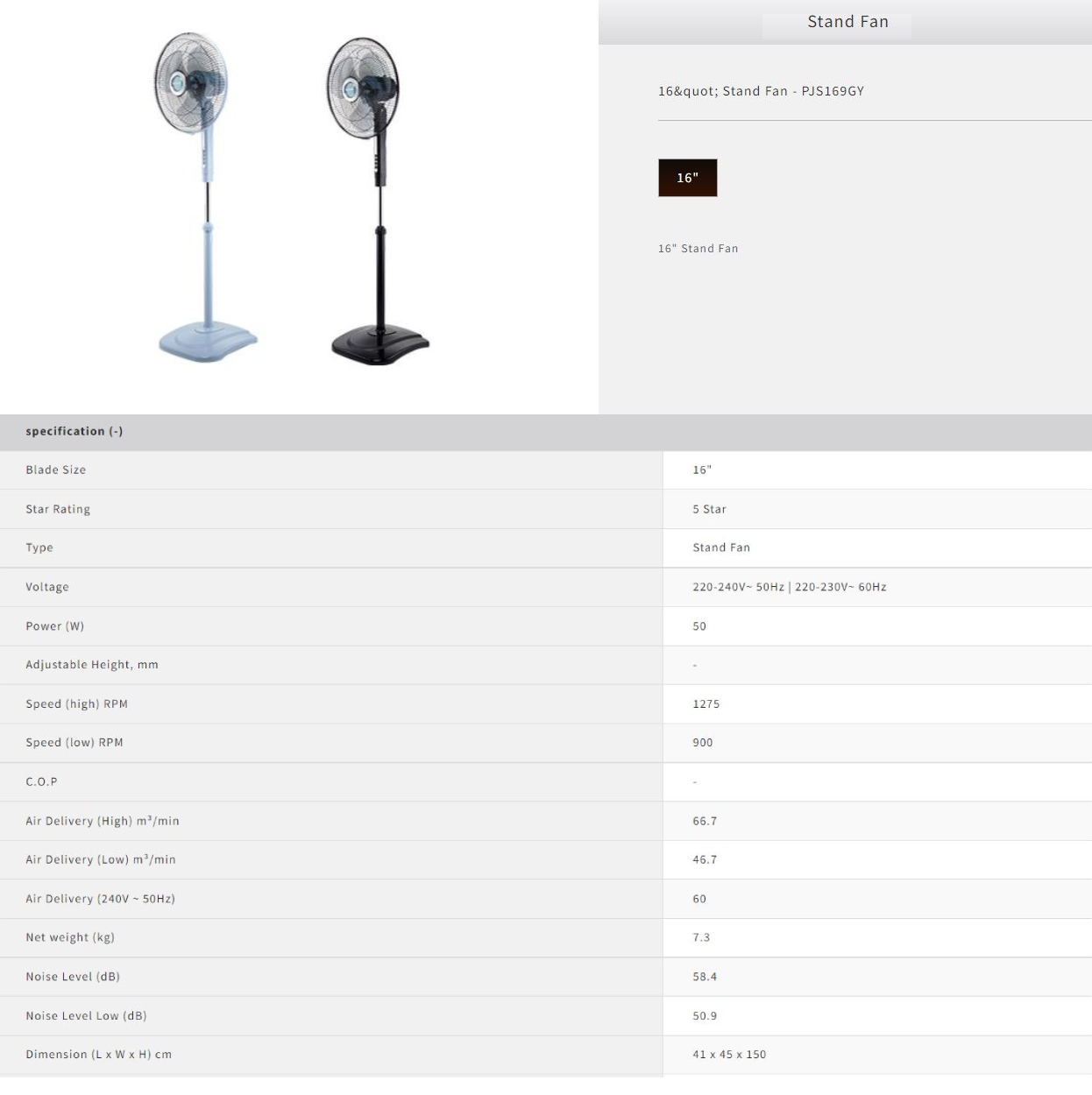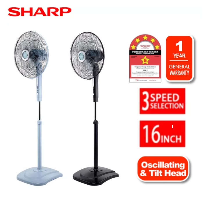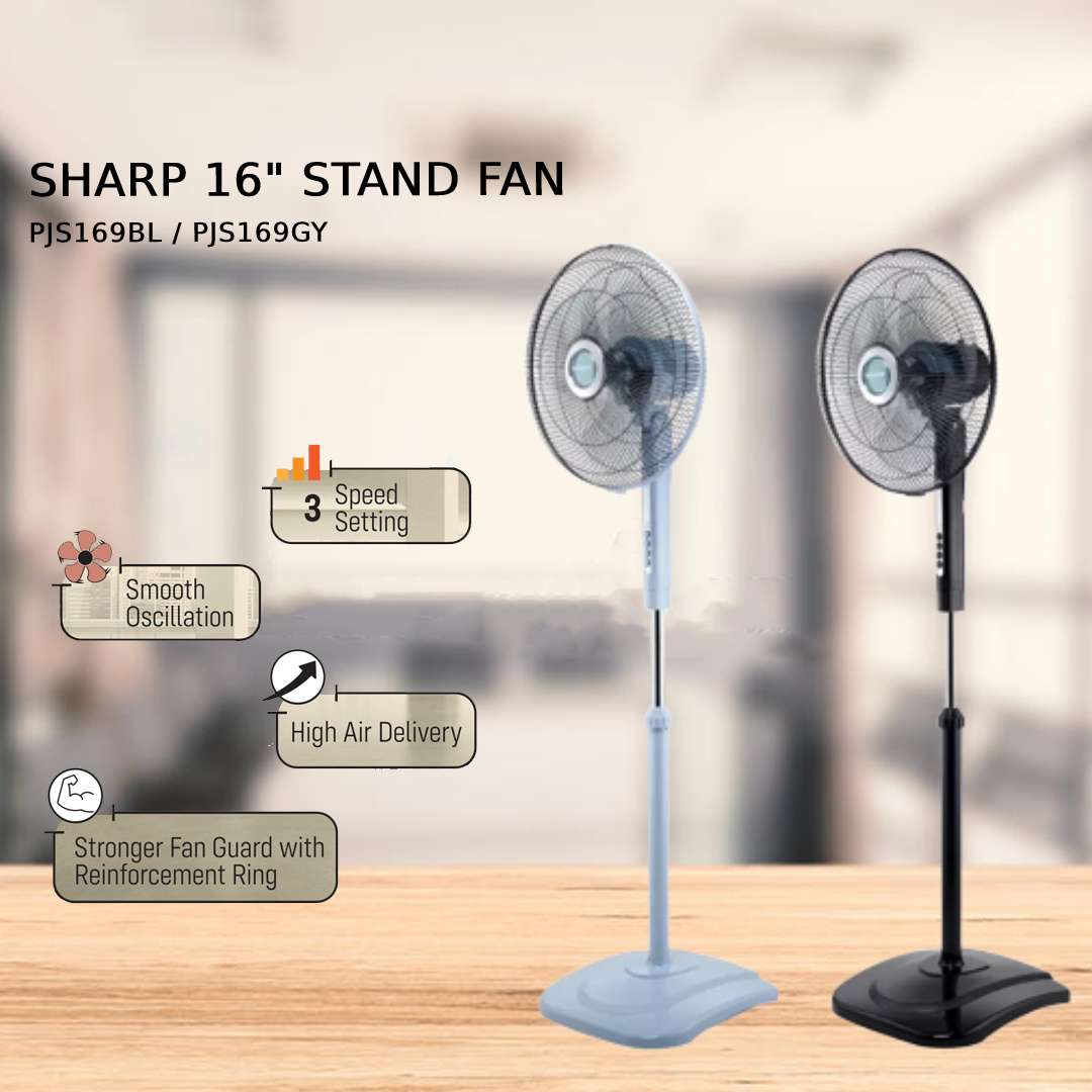 SHARP 16" Stand Fan PJS169GY | 3 Blades | 3 Adjustable Speed | 5 Star Energy Rating | Stand Fan with 1 Year Warranty