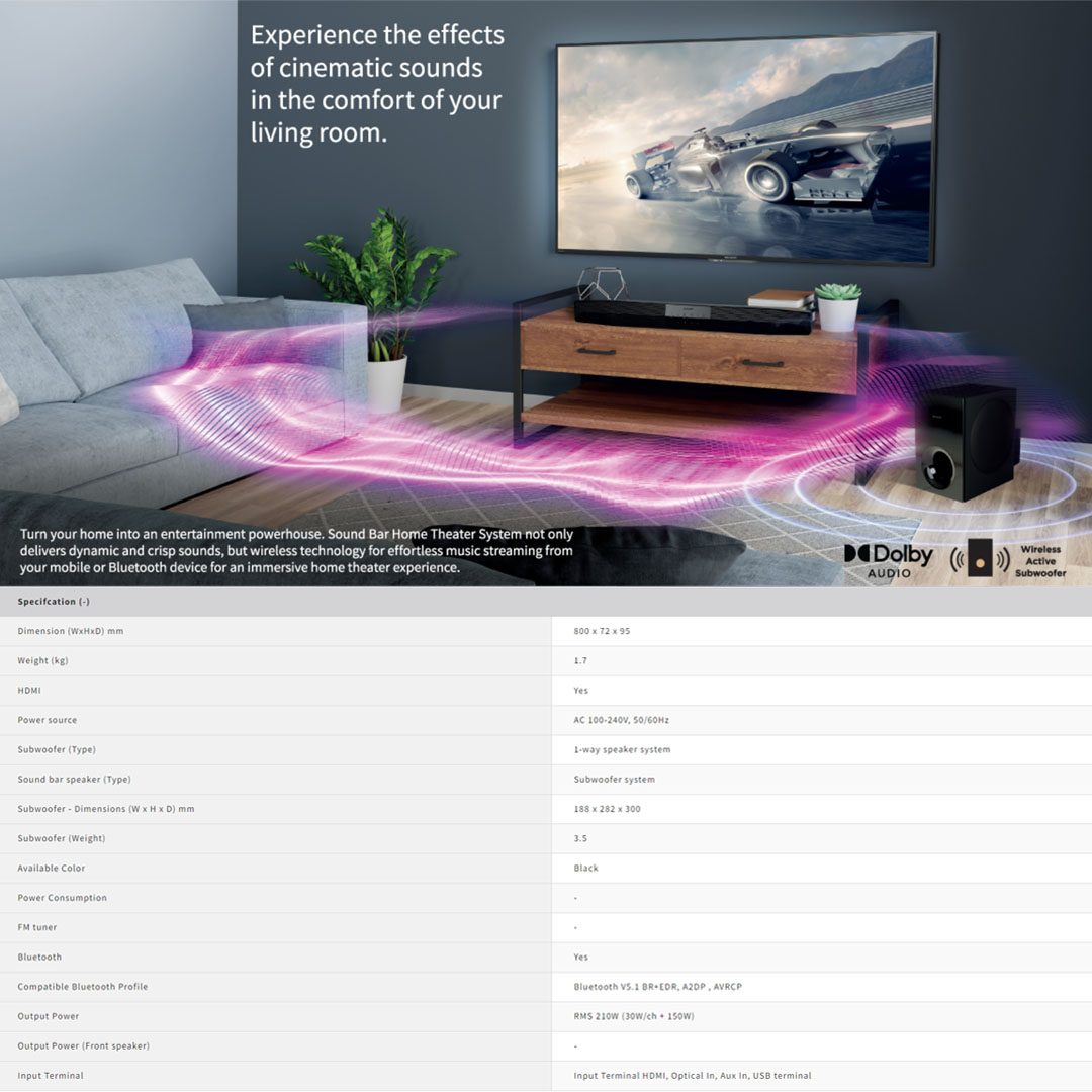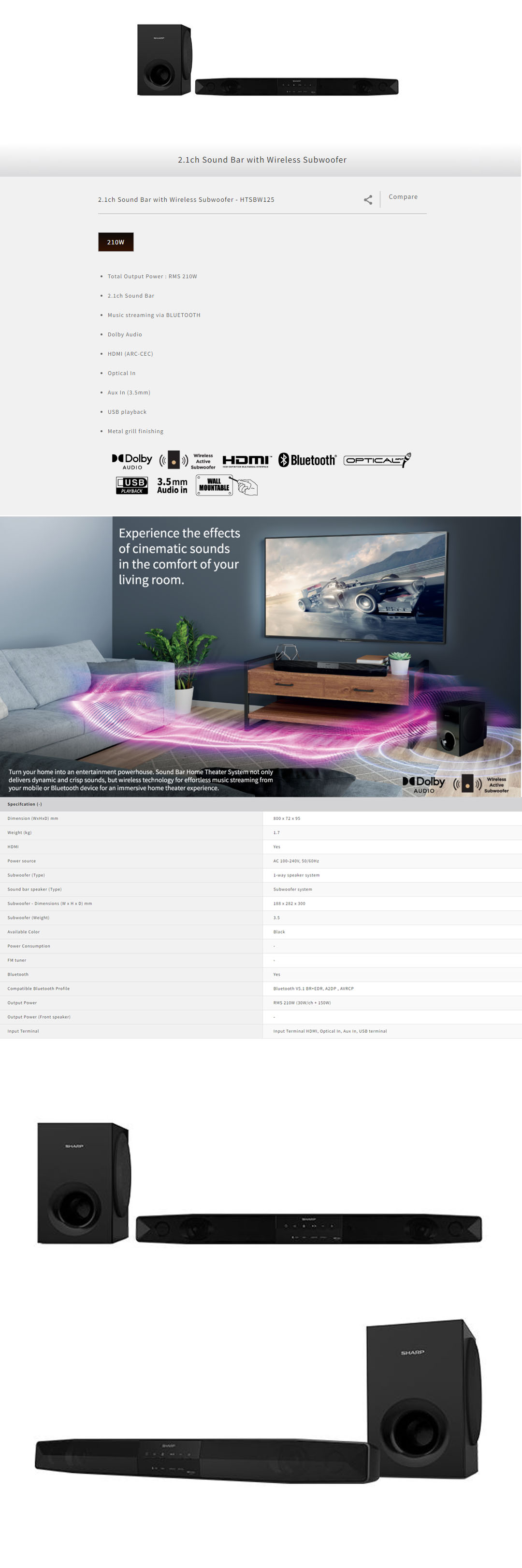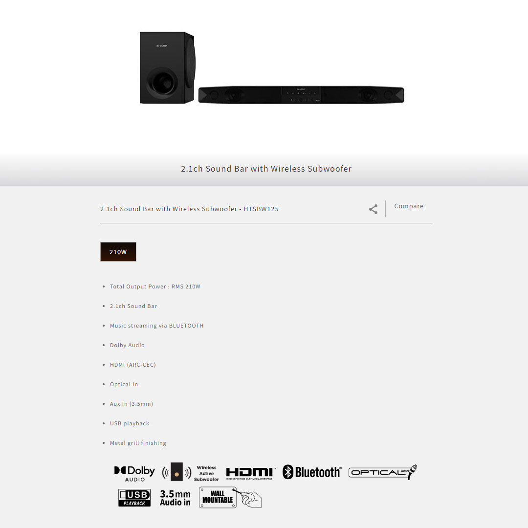 Sharp 210W 2.1ch Sound Bar with Wireless Subwoofer HTSBW125 | Music Streaming via Bluetooth | HDMI (ARC-CEC) | Dolby Audio | Optical In | Aux In | USB Playback | Soundbar with 1 Year Warranty