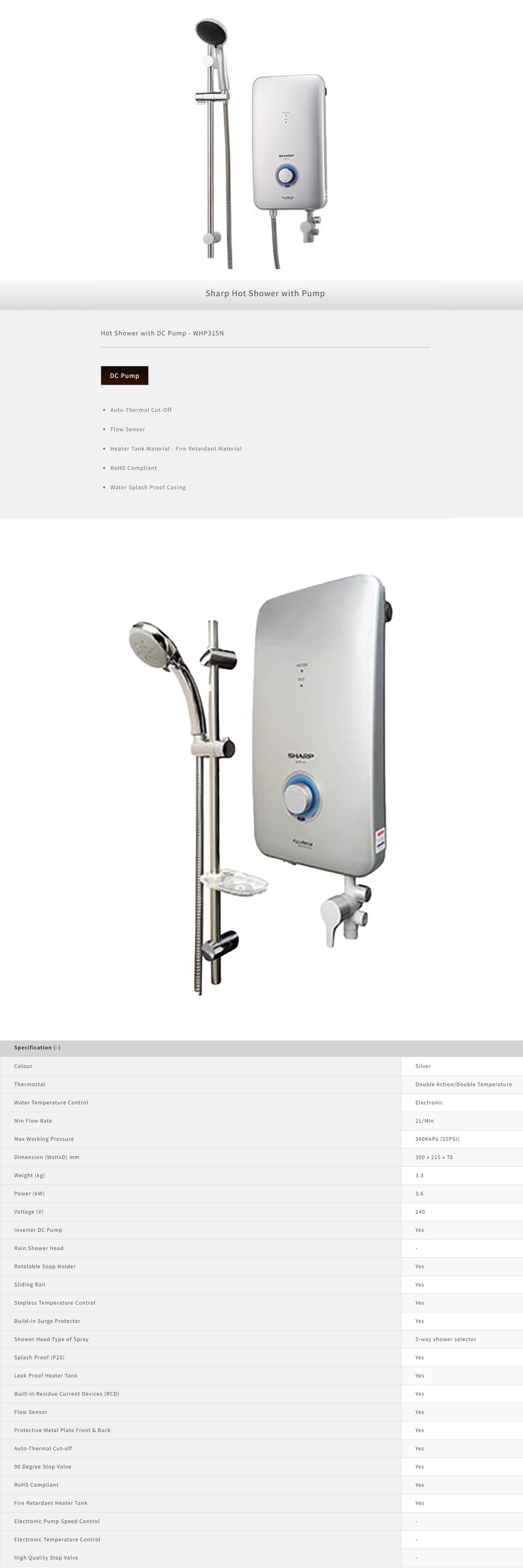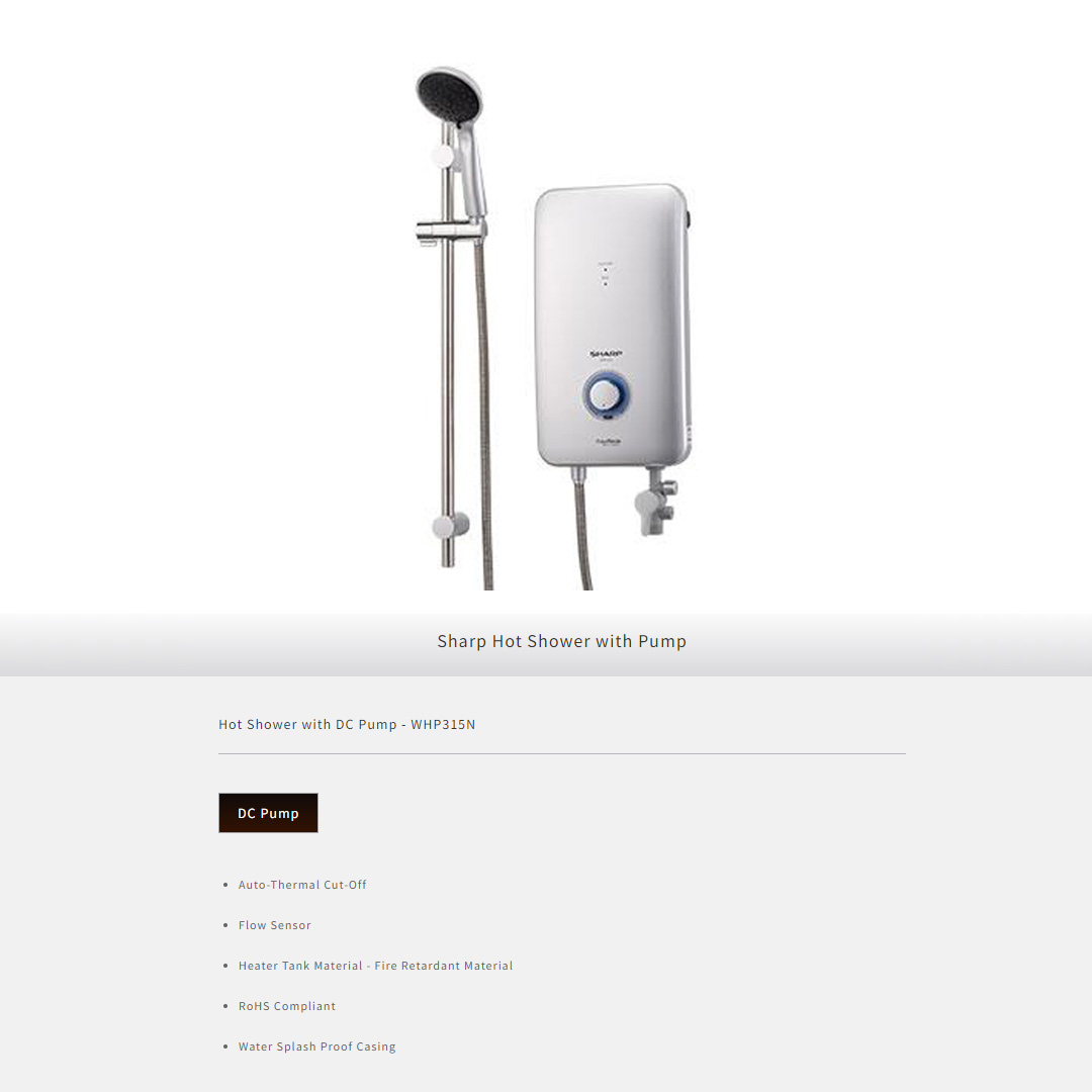 Sharp 3600W DC Pump Water Heater WHP315N | Auto-Thermal Cut-Off | Flow Sensor | Heater Tank Material | RoHS Compliant | Water Splash Proof Casing | 5-way Shower Selector | Water Heater with 1 Year Warranty