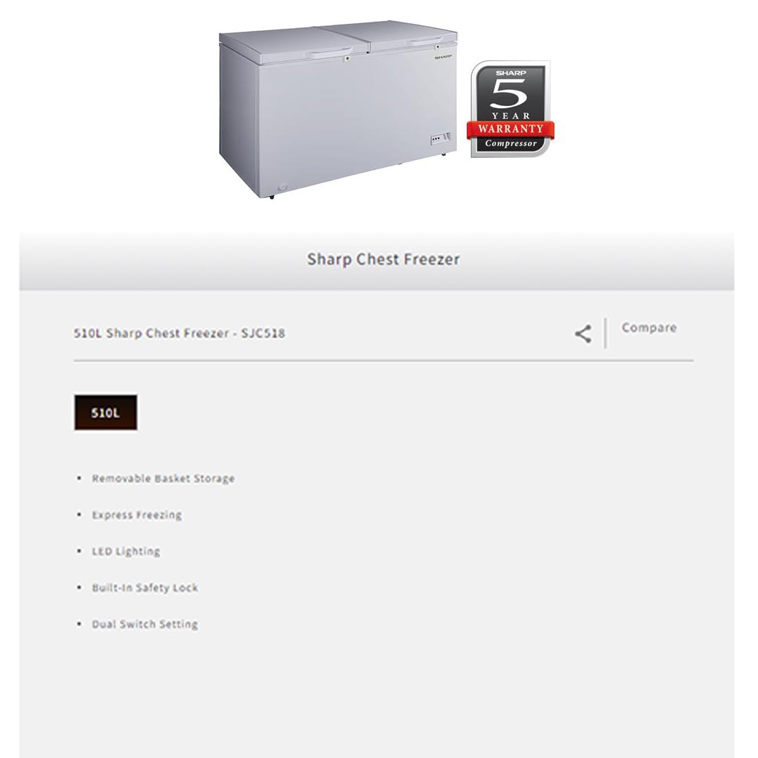 SHARP 510L Chest Freezer SJC518 | Express Freezing | Dual Switch Setting | Built-In Safety Lock | Removable Basket Storage | Chest Freezer with 1 Year General Warranty & 5 Years Compressor Warranty