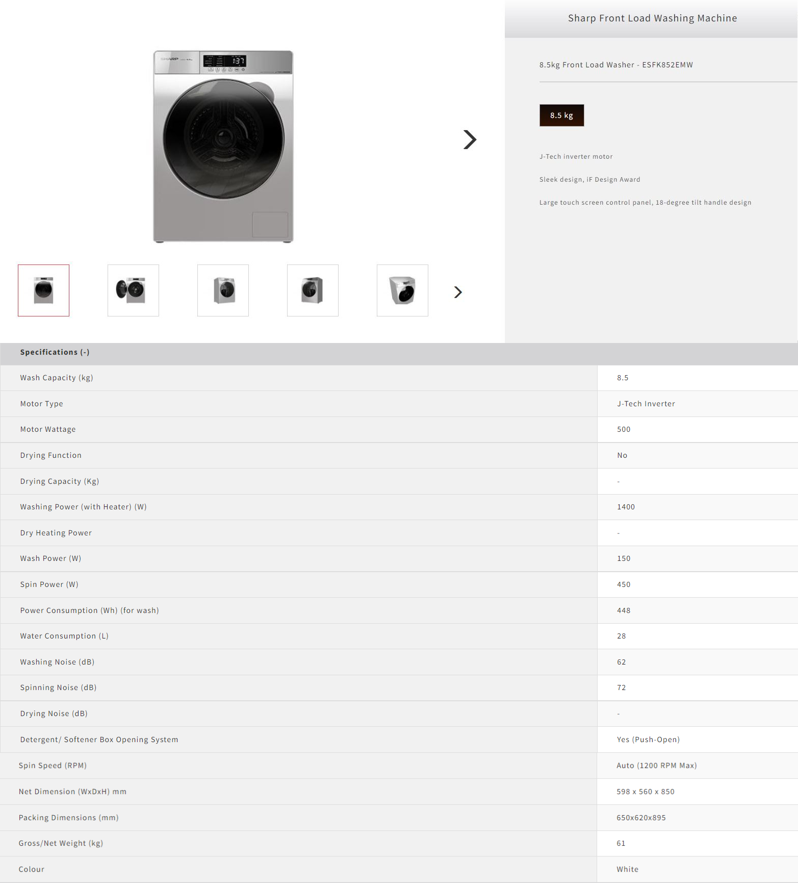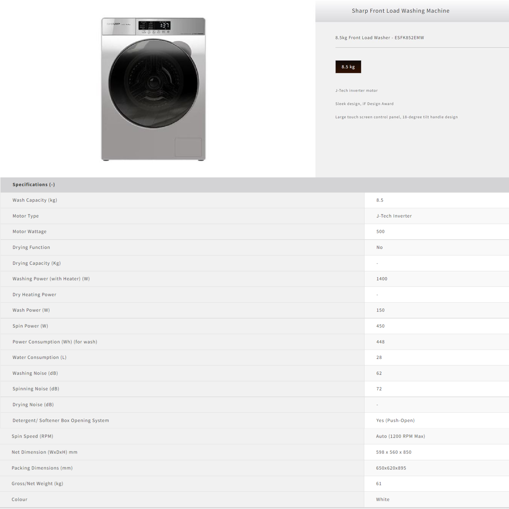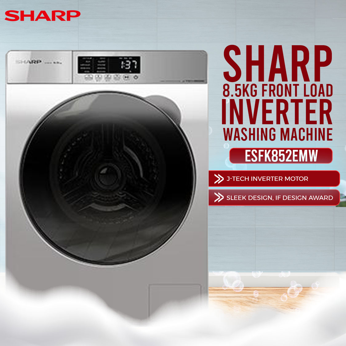 SHARP 8.5KG Front Load J-Tech Inverter Washing Machine ESFK852EMW | J-Tech Inverter Motor | Door-Lock Releasing Lever | Intelligent Inverter Motor | Overflow Control | Auto Power Off | Washing Machine with 2 Year General Warranty & 12 Year Motor Warranty