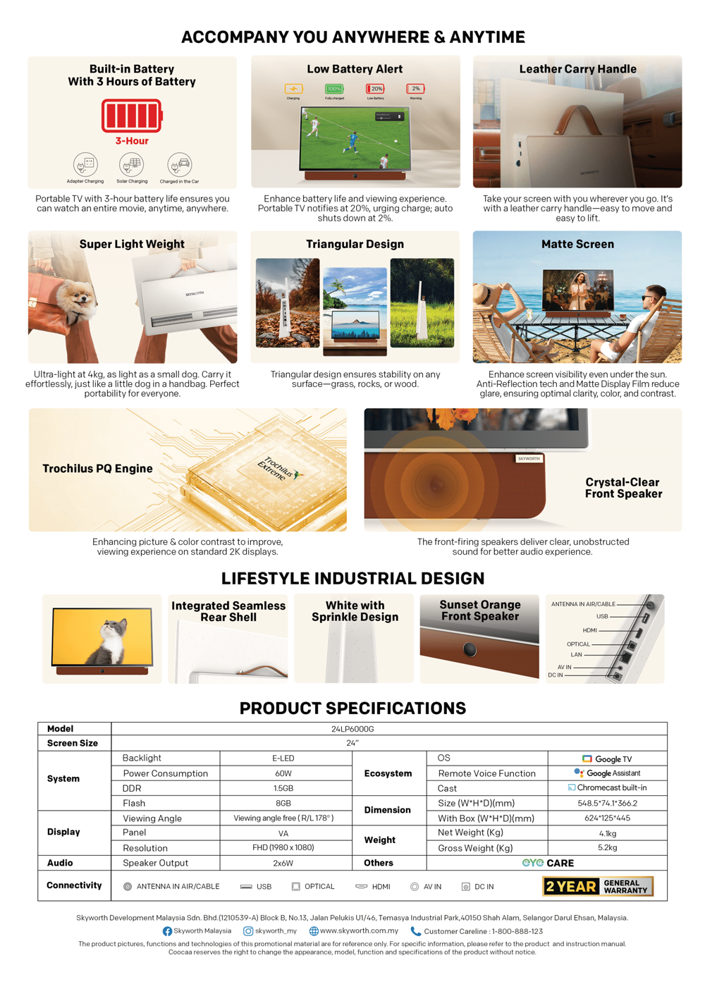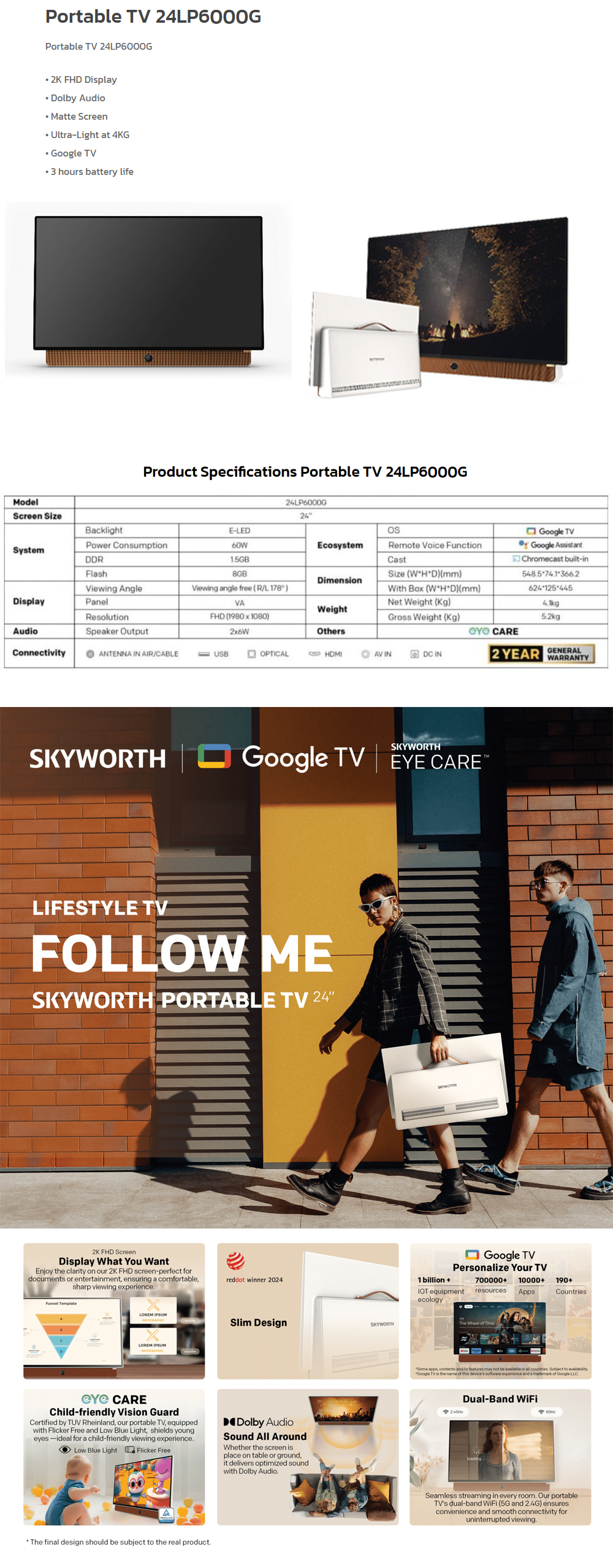 SKYWORTH 24'' 2K FHD Portable TV 24LP6000G | Slim Design, Leather Carry Handle, Super Light Weight | 3 hours battery life