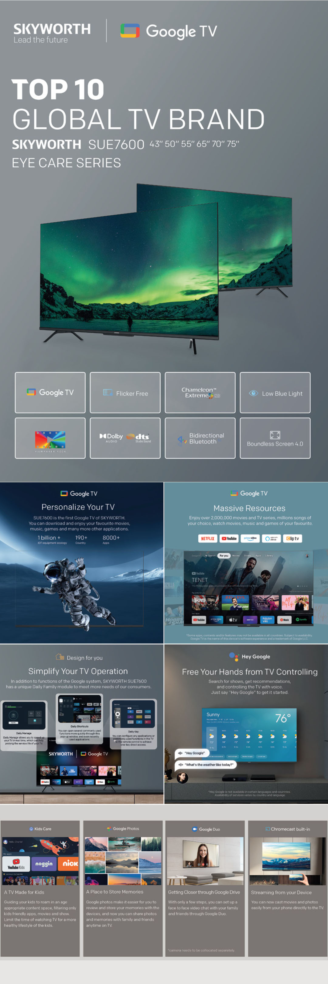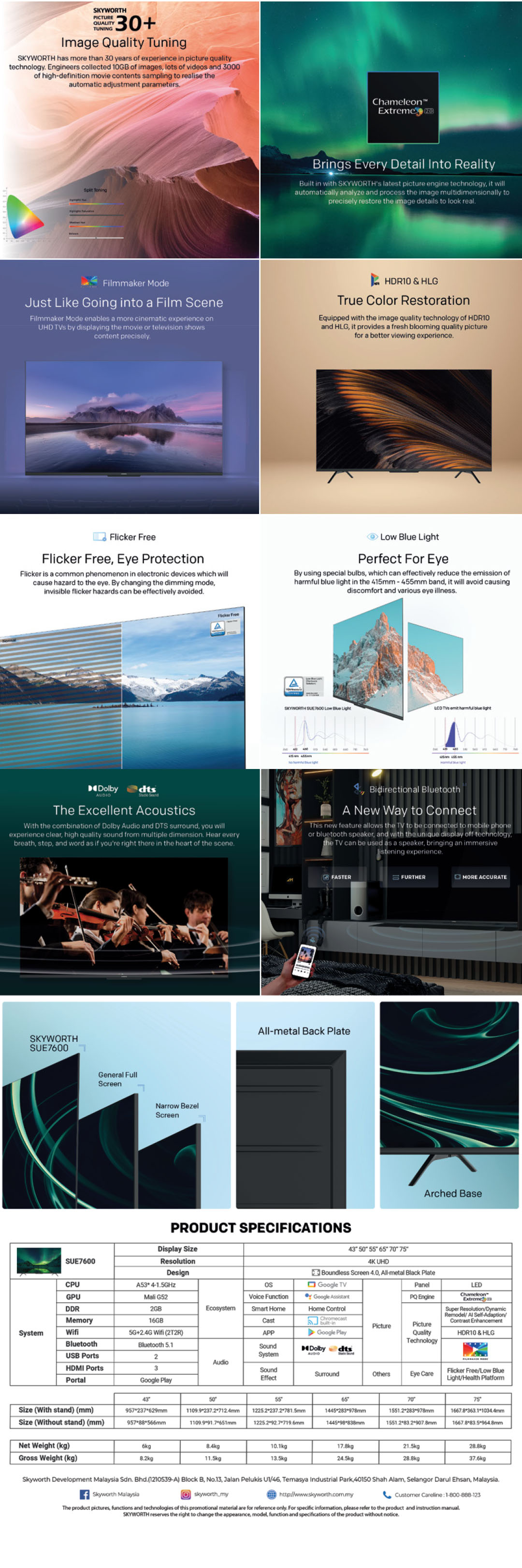 SKYWORTH 43"/ 50"/ 55"/ 65"/ 75" 4K UHD Google TV 43SUE7600 / 50SUE7600 / 55SUE7600 / 65SUE7600 / 75SUE7600 | HDR10 | Dolby Audio | Chameleon Extreme 2.0 | Chromecast Built-In | Google TV with 2 Year Warranty