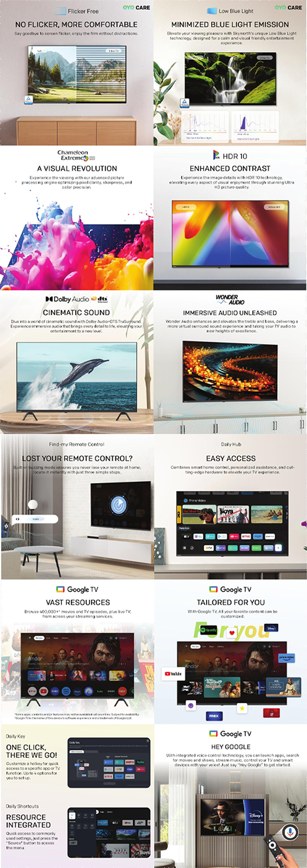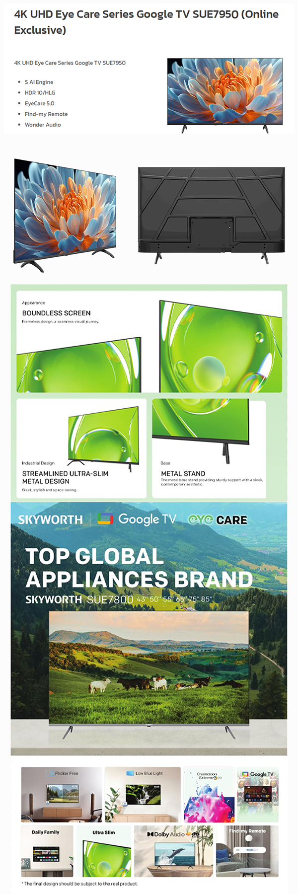 SKYWORTH 50" / 55" / 65" 4K UHD Eye Care Series Google TV SUE7950 | S AI Engine | HDR 10/HLG | EyeCare 5.0 | Find-my Remote