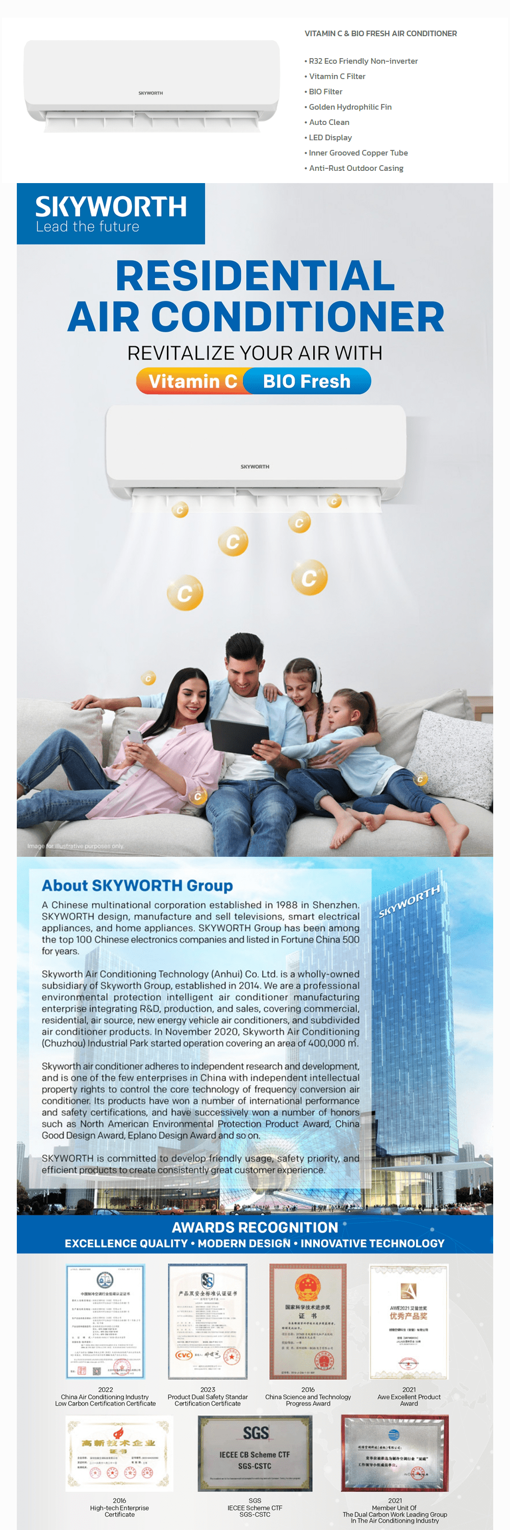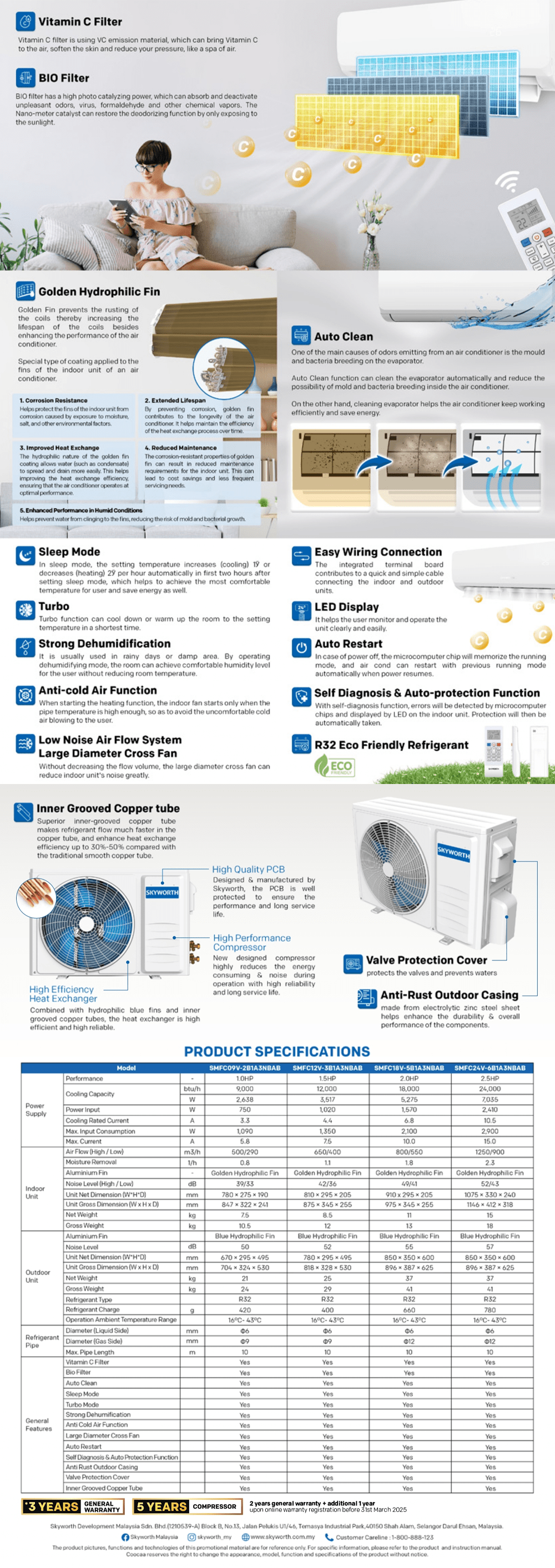 SKYWORTH R32 Eco Friendly Vitamin C & Bio Fresh Air Conditioner SMFC09V-2B1A3NBAB SMFC12V-3B1A3NBAB SMFC18V-5B1A3NBAB SMFC24V-6B1A3NBAB | BIO Filter | Vitamin C Filter