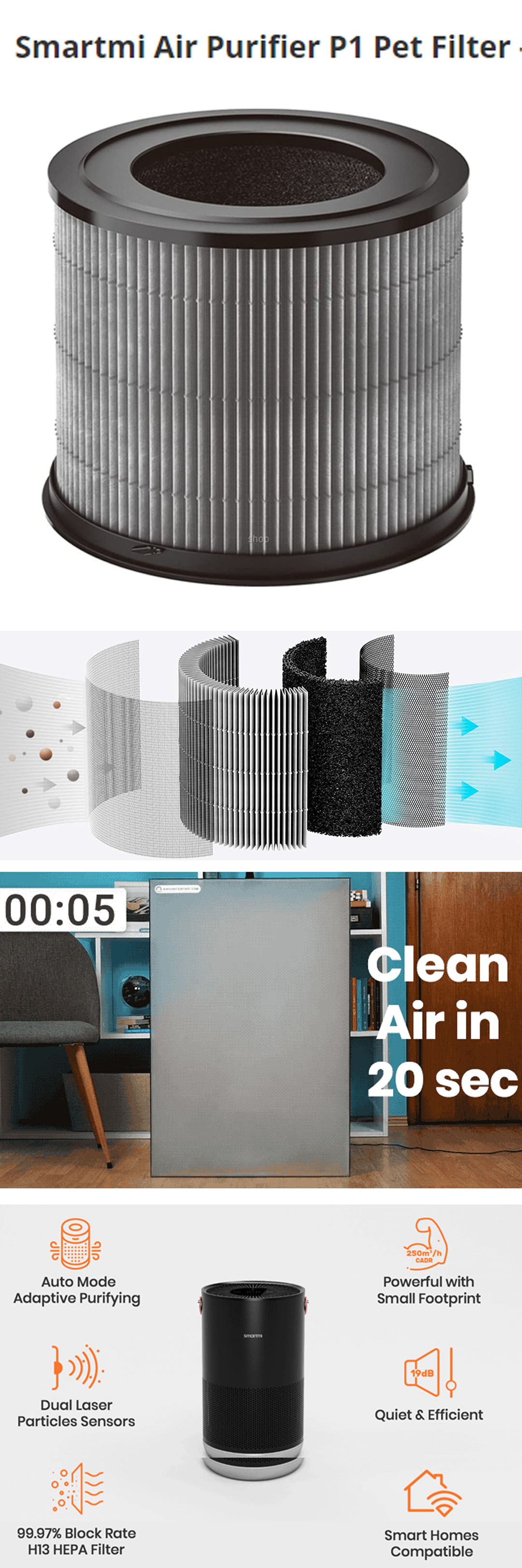 Smartmi Air Purifier P1 Pet Filter ZMFL-P1-C | H13 True HEPA Filter | Carbon Filter | Inner Filter | Odor Remover | Accessories with 1 Year Warranty