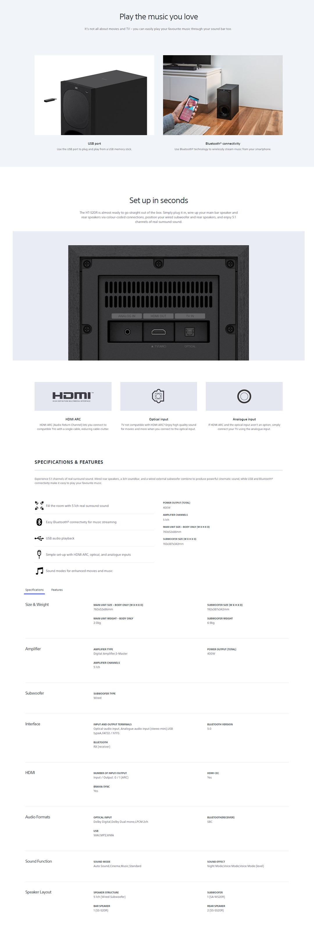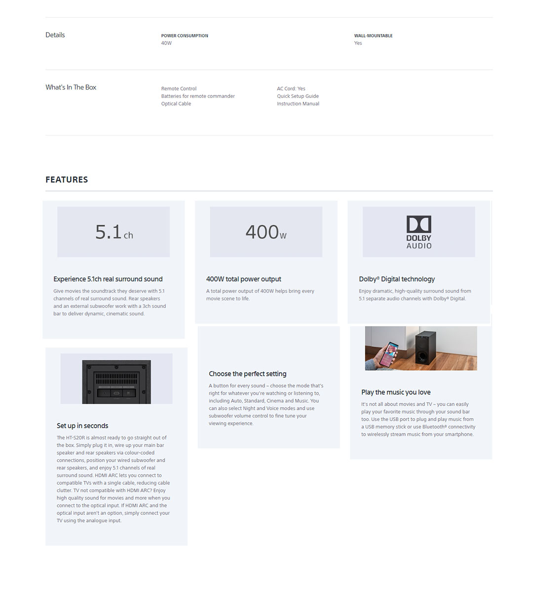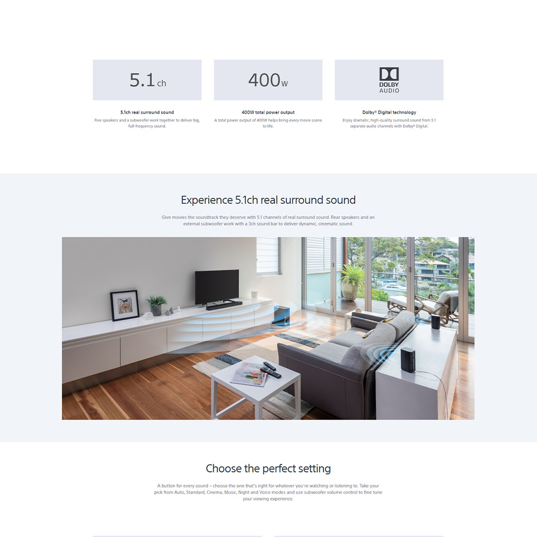 SONY 400W 5.1ch Home Cinema Soundbar System HT-S20R | Digital Amplifier | Bluetooth 5.0 | Dolby Digital | Wired Subwoofer | HDMI | USB | Voice Mode | Soundbar with 1 Year Warranty