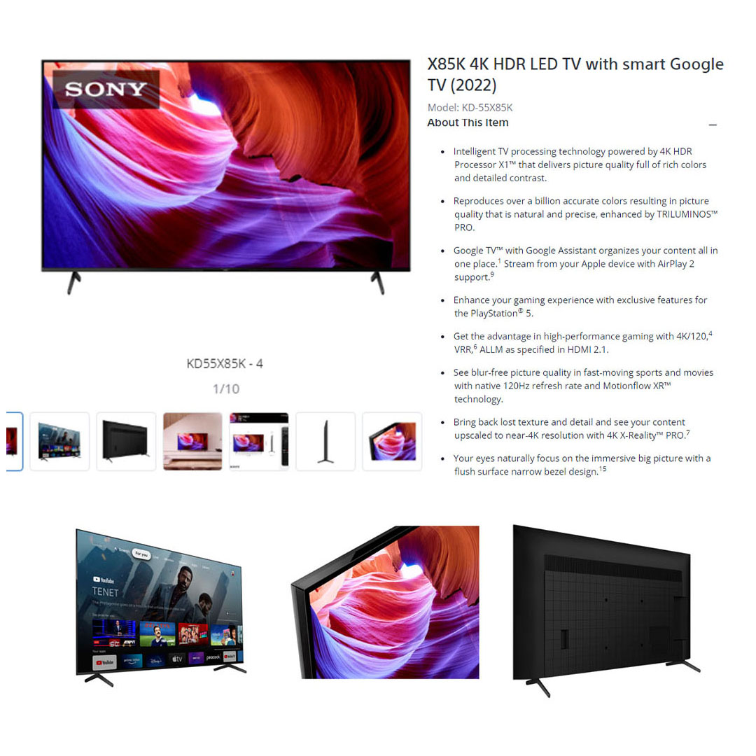 SONY 55" 4K UHD High Dynamic Range (HDR) Smart TV (Google TV) KD-55X85K | 4K HDR Processor X1 | TRILUMINOS PRO | X-Balanced Speaker | Motionflow™ XR | Smart TV with 2 Year Warranty