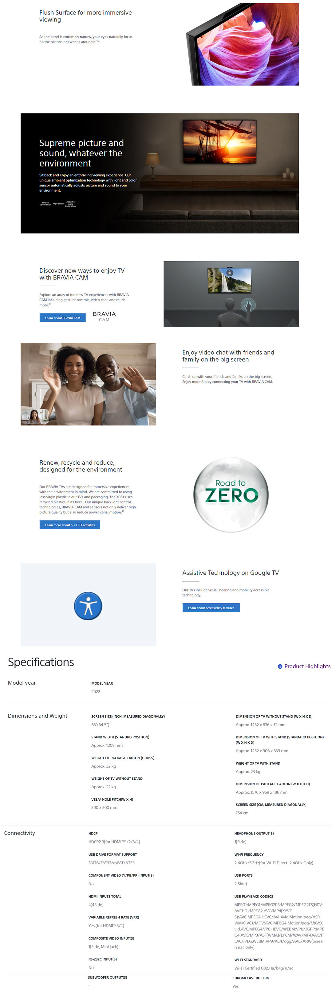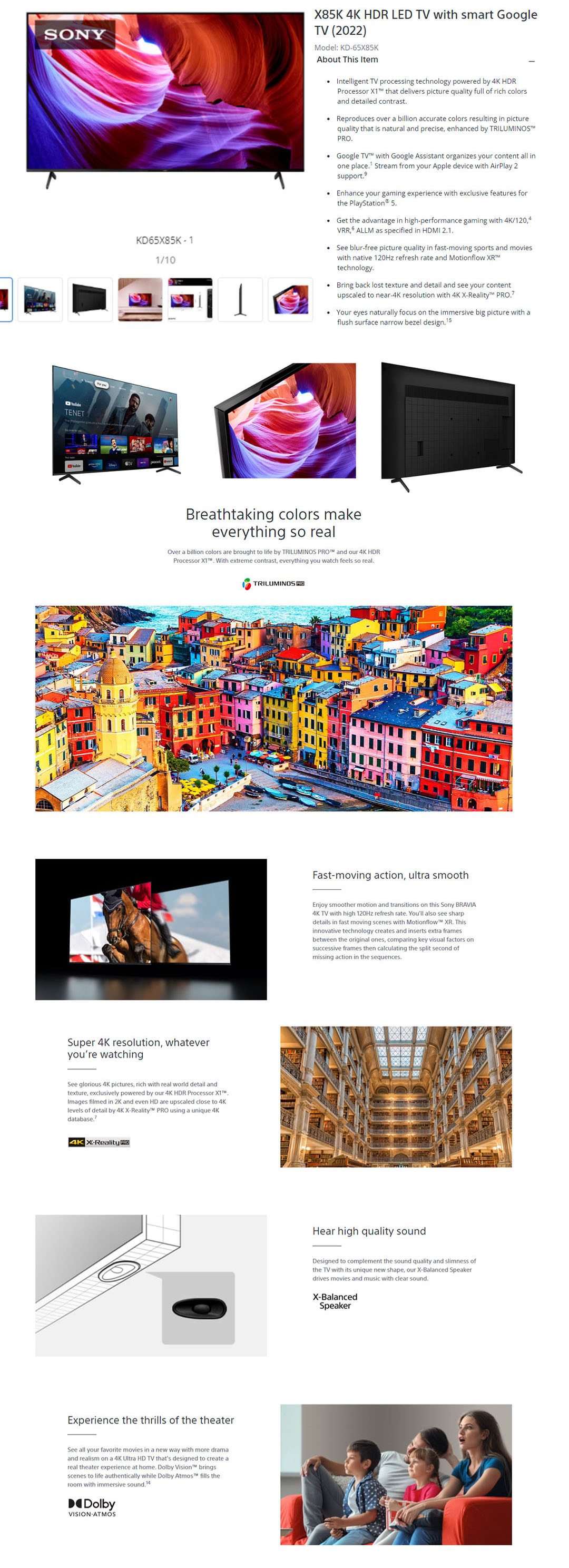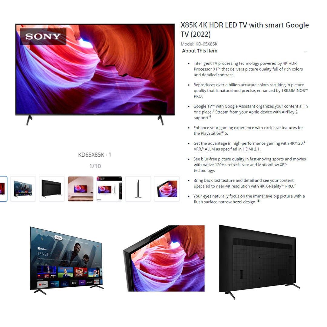 SONY 65" 4K UHD High Dynamic Range (HDR) Smart TV (Google TV) KD-65X85K | USB | Bluetooth | Dolby Audio | Chromecast Built-In | HDMI | Voice Search | Sleep Timer | Android TV | Smart TV with 2 Year Warranty