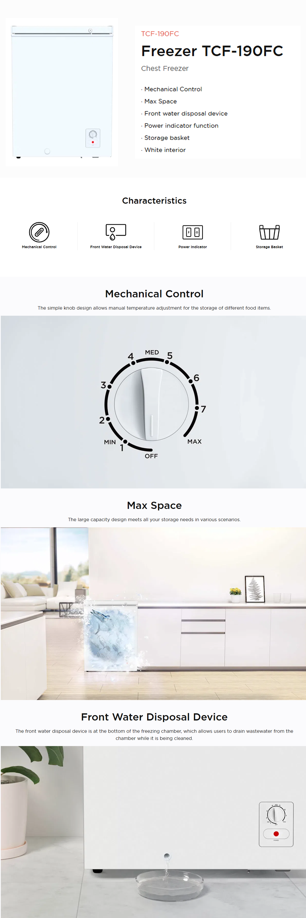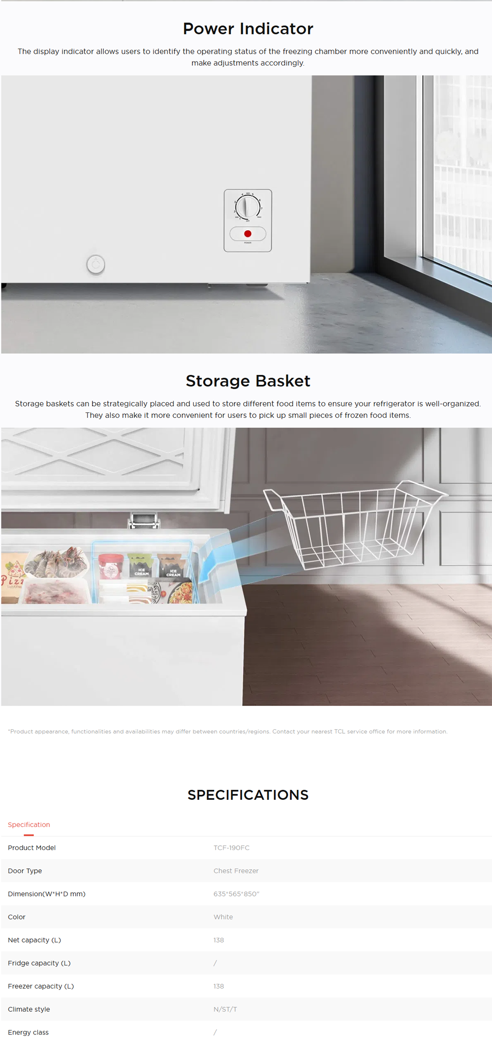 TCL 190L/280L Chest Freezer TCF-190FC/TCF-280FC | Power indicator function | Mechanical Control | Storage basket