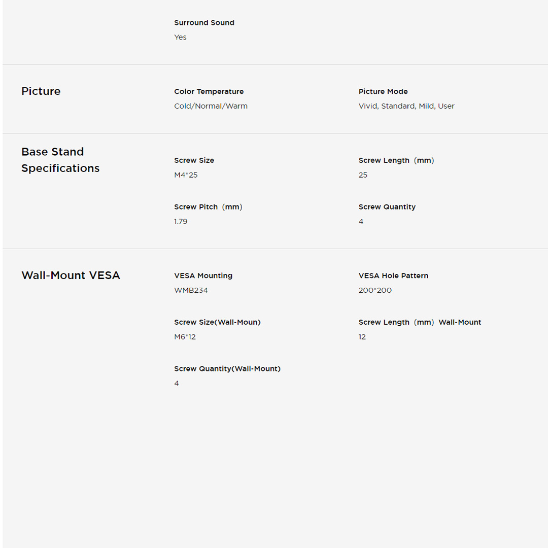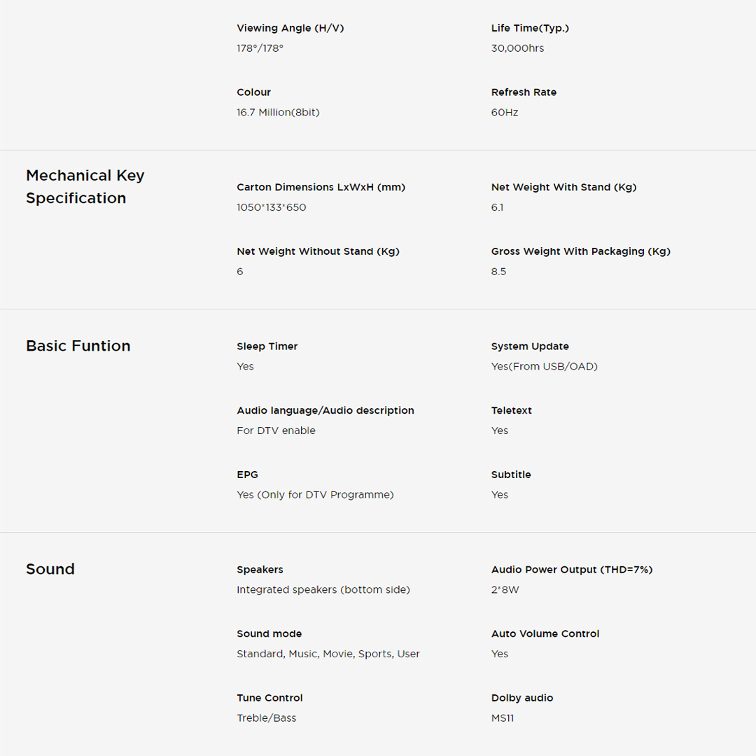 ● Sleep Timer ● Teletext ● EPG ● Treble/Bass ● Dolby Audio
