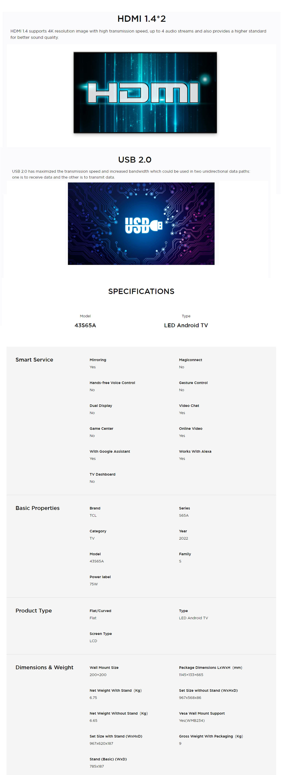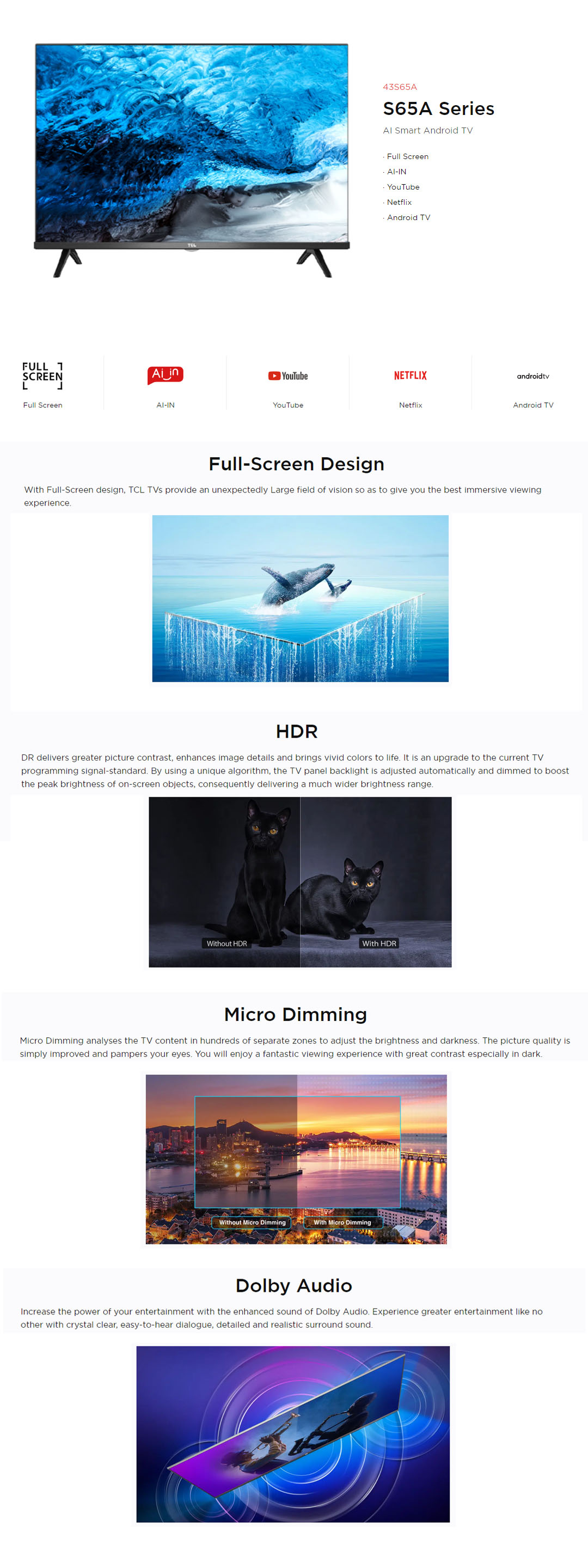 TCL 43" FHD Android LED TV 43S65A | Wi-Fi 2.4 | Android R | Voice Control | ECO Mode | Google Assistant | Bluetooth | Ethernet | HDMI 1.4 | Dolby Audio | LED TV with 1 Year Warranty