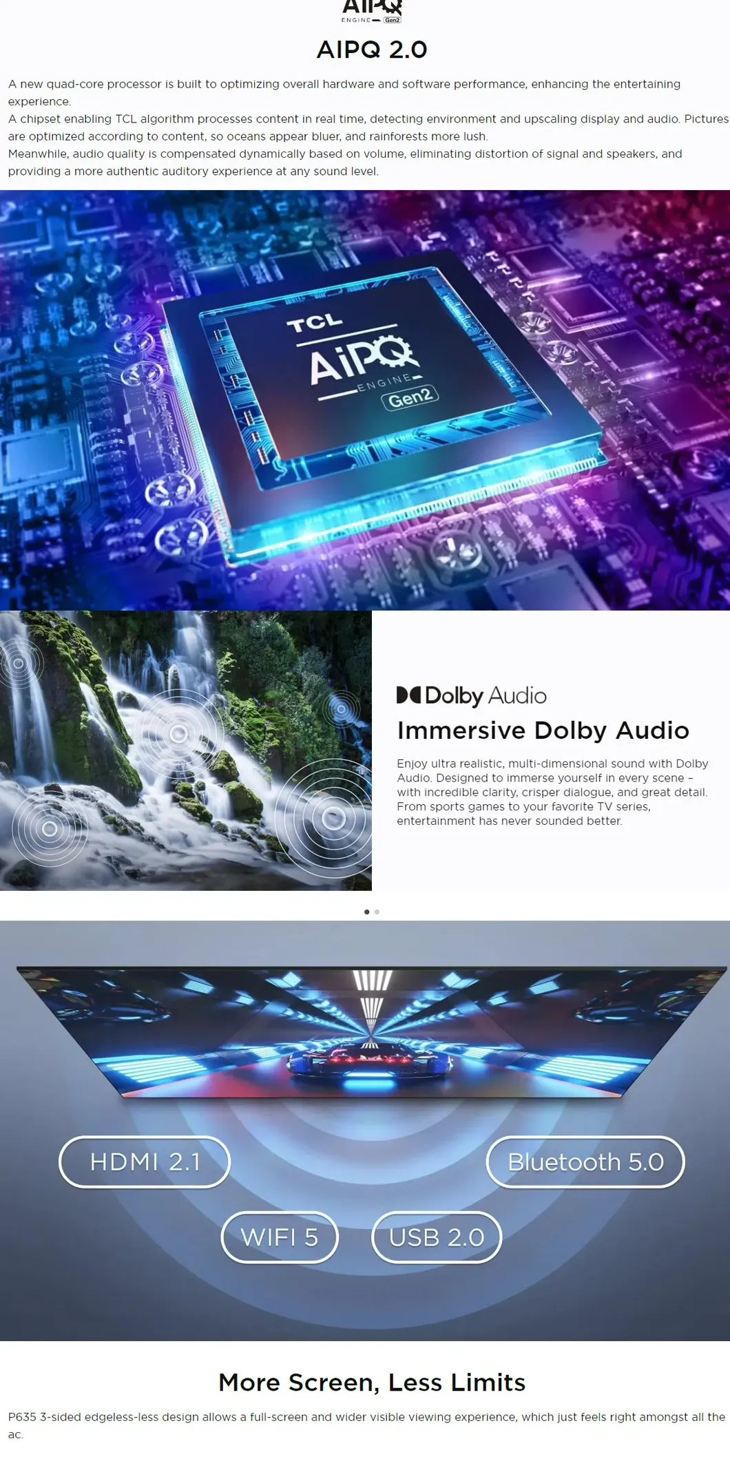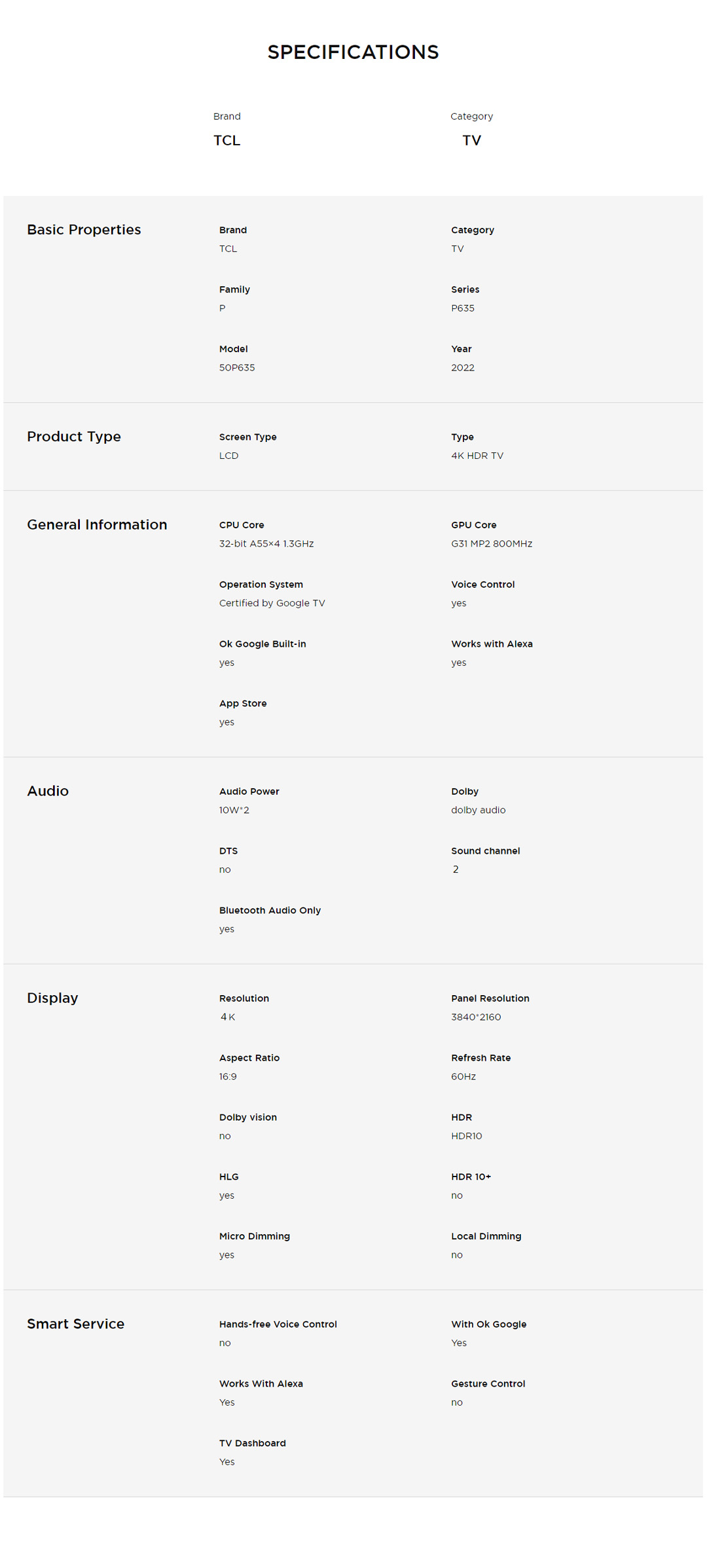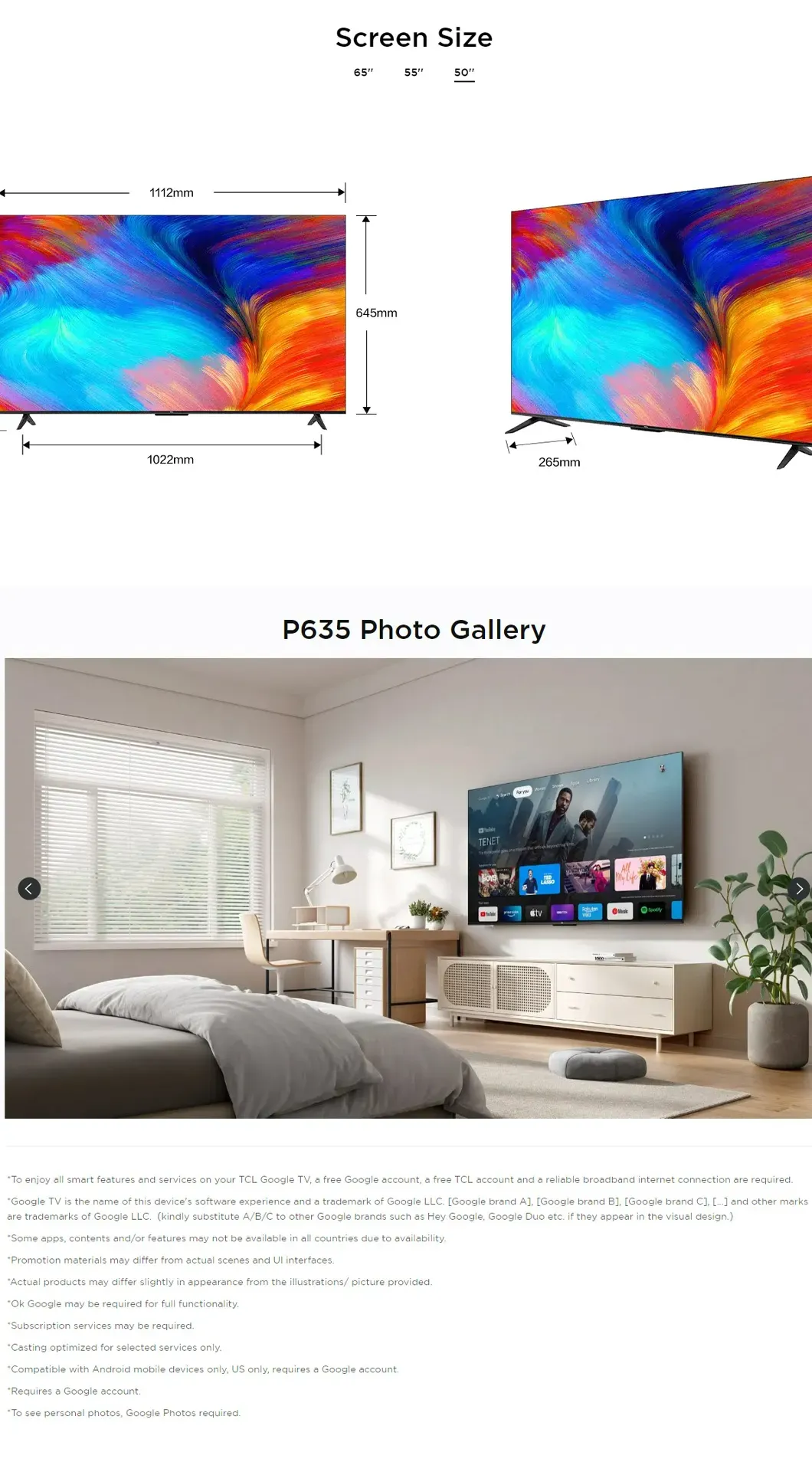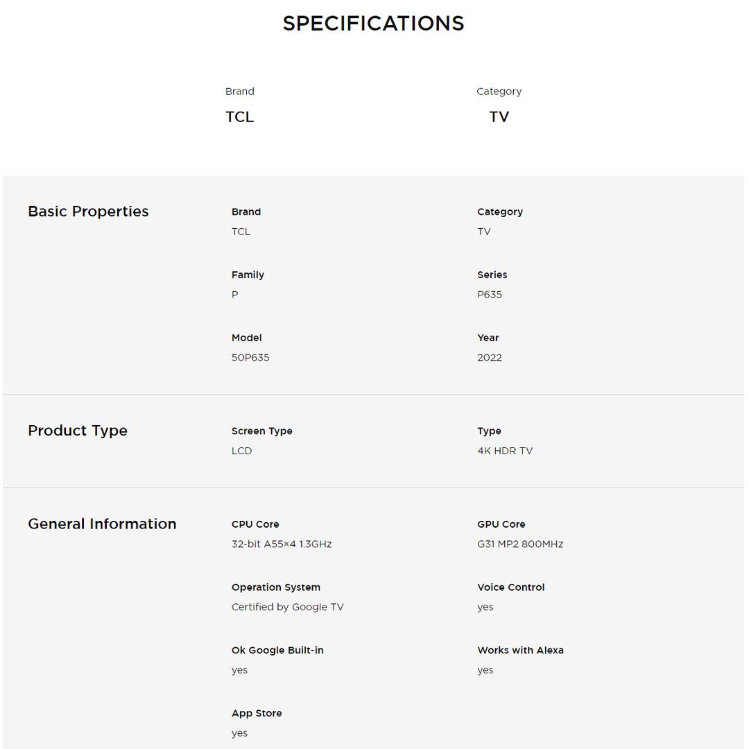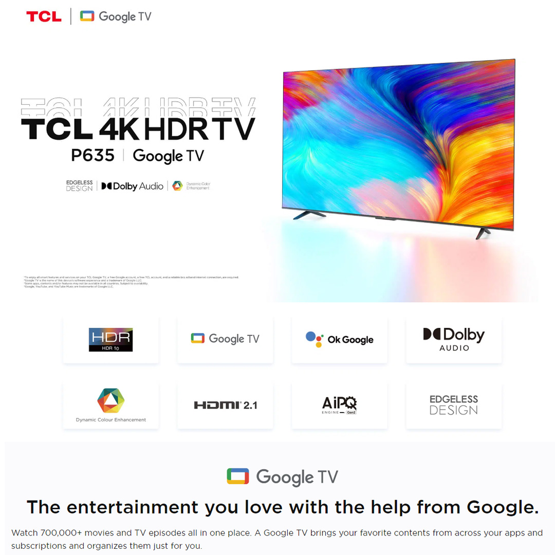 TCL 50" 4K UHD Google LED TV 50P635 | USB 2.0 | HDR 10 | HDMI 2.1 | WiFi 5 | Google TV | Dolby Audio | Bluetooth 5.0 | Smart TV with 2 Year Warranty