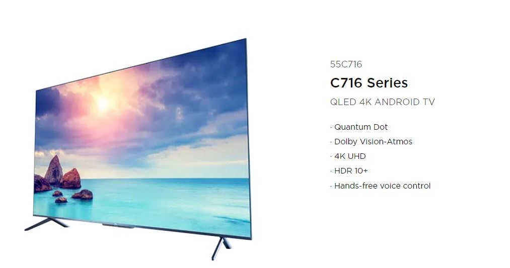 TCL 55" 4K UHD Android QLED TV 55C716 | Quantum Dot | Dolby Vision-Atmos | 4K UHD | HDR 10+ | Hands-Free Voice Control | IPQ Engine | Android TV with 2 Years Warranty