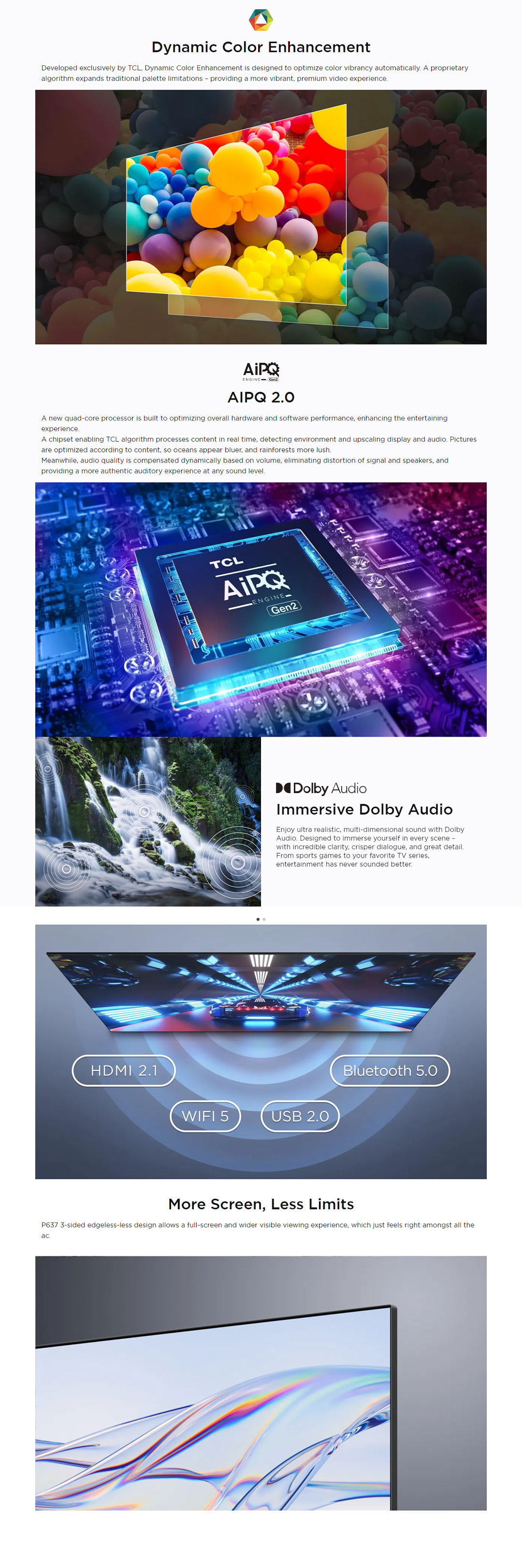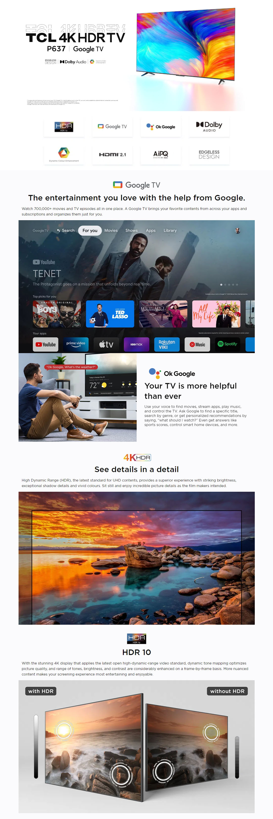 TCL 65" 4K HDR Google TV 65P637 | Dynamic Color Enhancement | AIPQ 2.0 | DTV EPG(without IP EPG) | Smart TV with 2 Year Warranty