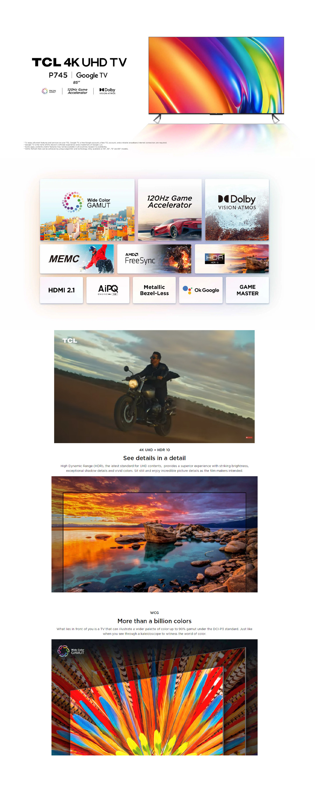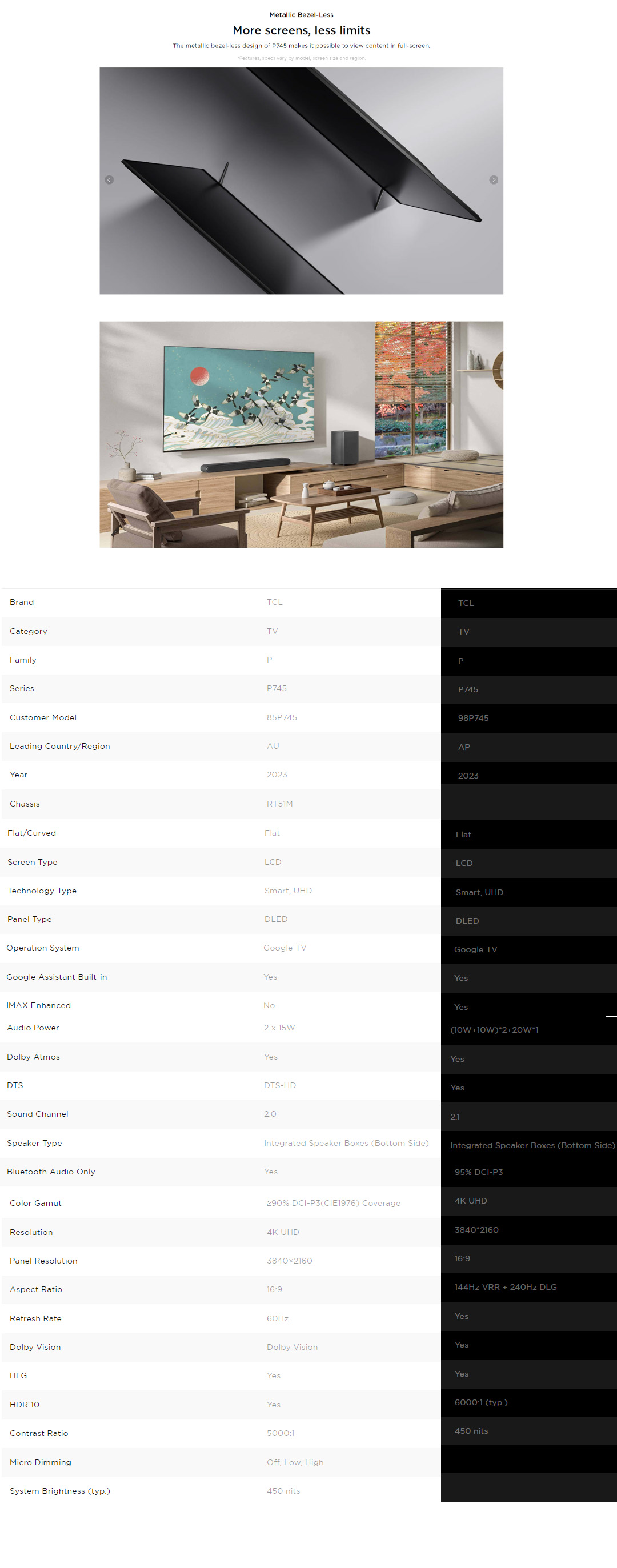 TCL 85" / 98" 4K UHD Google TV | 85P745 / 98P745 | 4K UHD + HDR 10 | 120Hz Game Accelerator | AiPQ Engine 3.0 | Google TV with 2 Year warranty