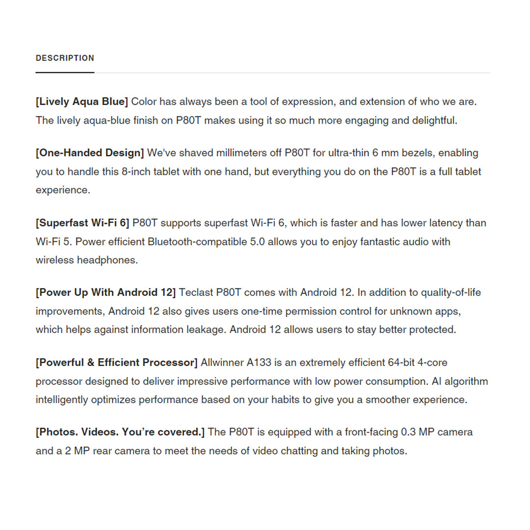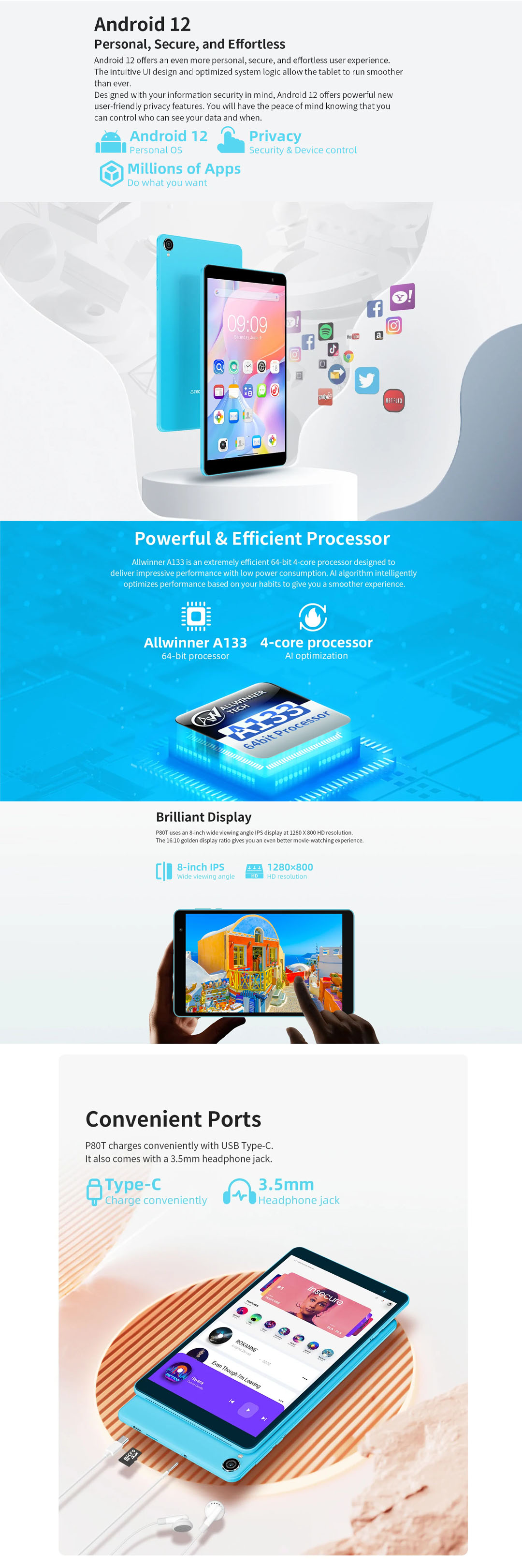 · Superfast Wi-Fi 6 · Power Up With Android 12 · Allwinner A133 Processor