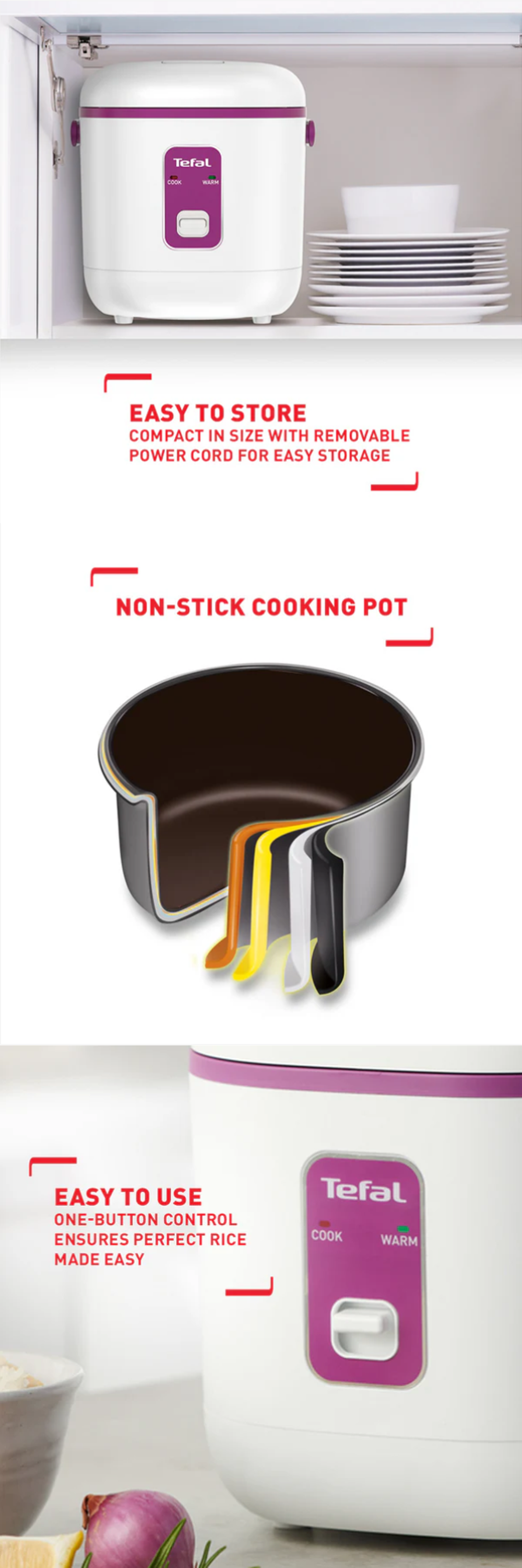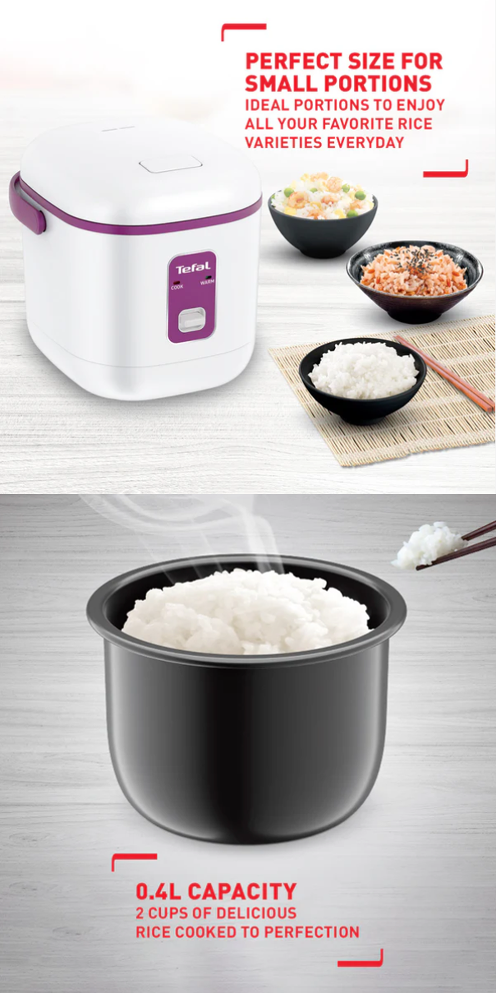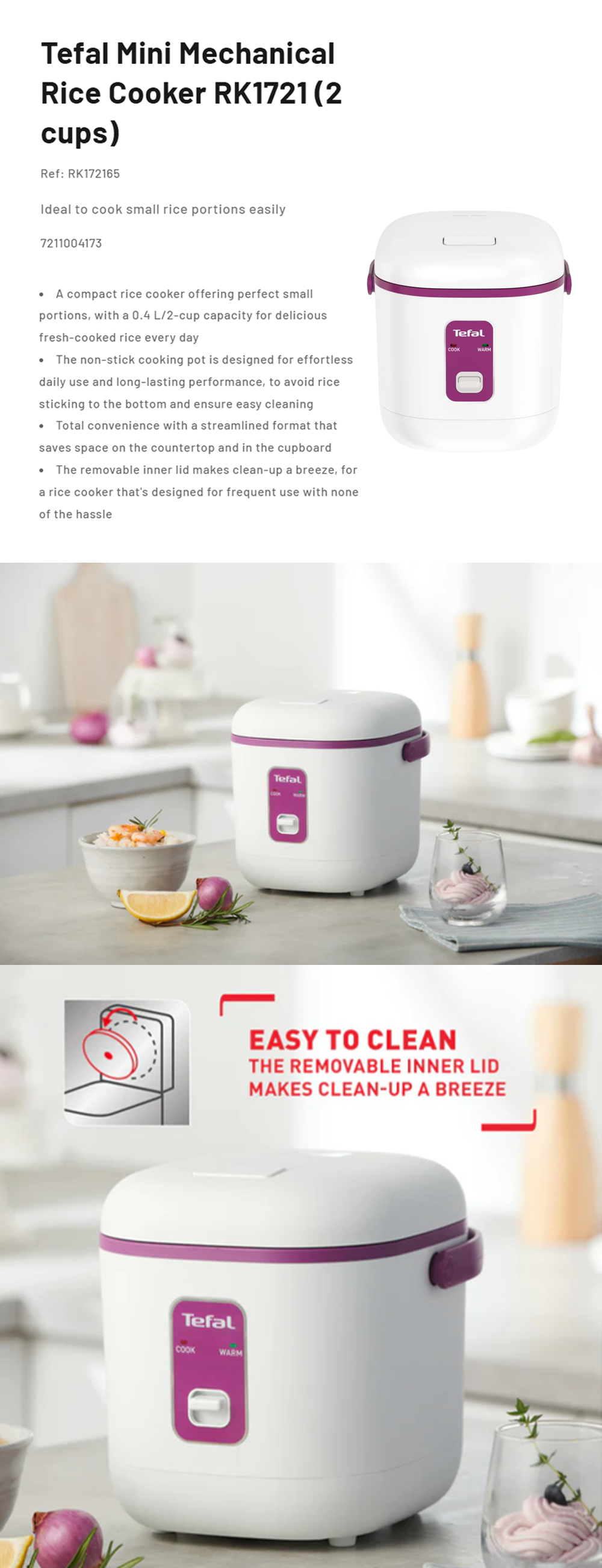 Tefal 0.4L Mini Mechanical Rice Cooker RK172165 | 0.4 L / 2-cup capacity | Non-stick cooking pot | Removable inner lid- Easy to Clean | Compact in size- Easy to Store