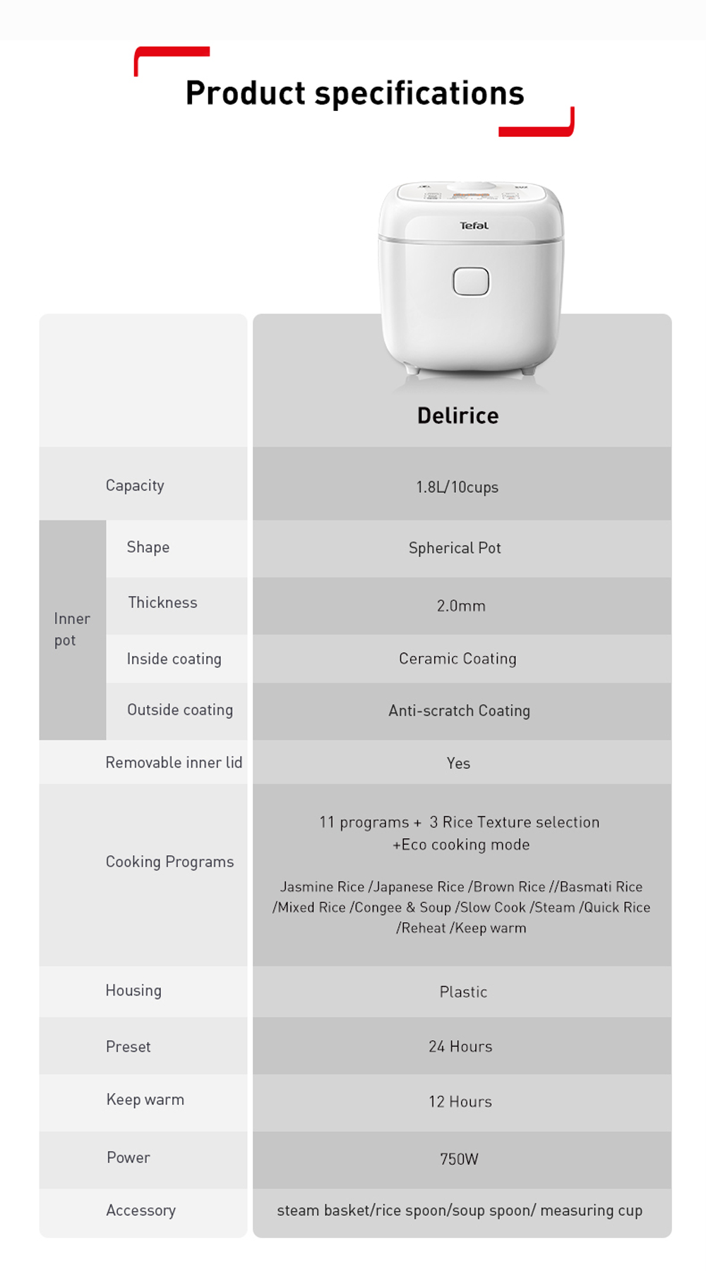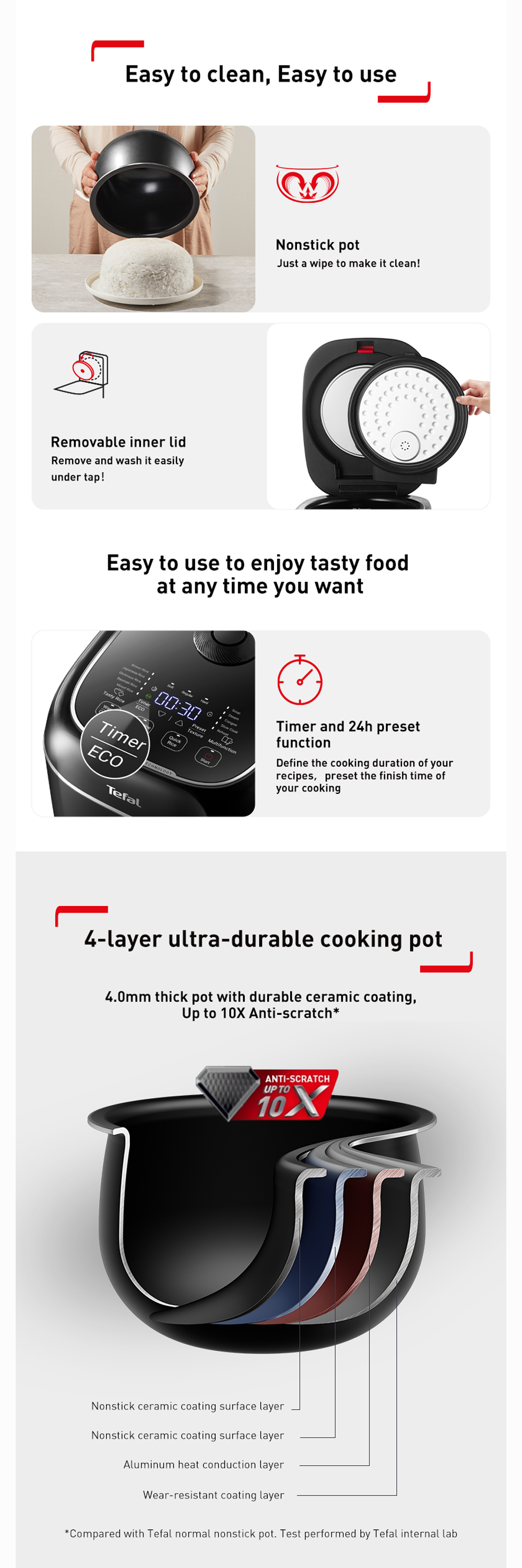 • The rice cooker's pot boasts 10x stronger anti-scratch performance