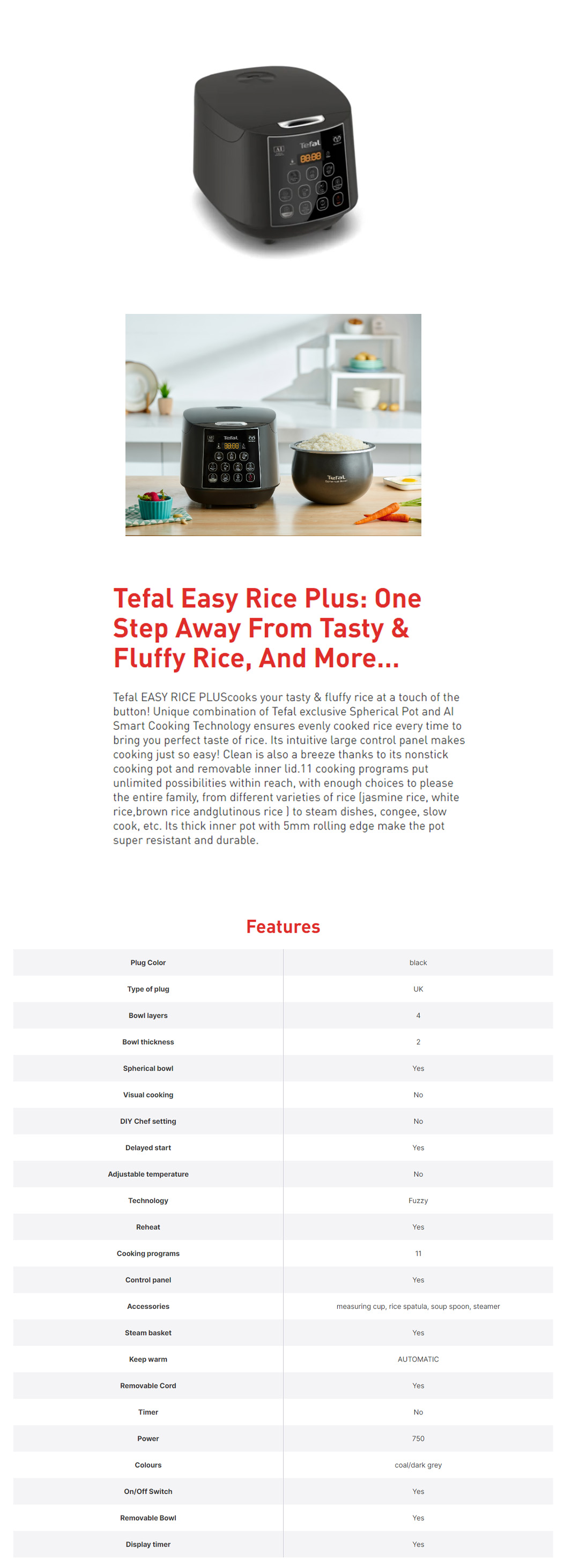Tefal 1.8L Easy Rice Fuzzy Plus Logic Rice Cooker RK736B | 750W Power | Reheat | Control Panel | Display Timer | Rice Cooker with 2 Year Warranty