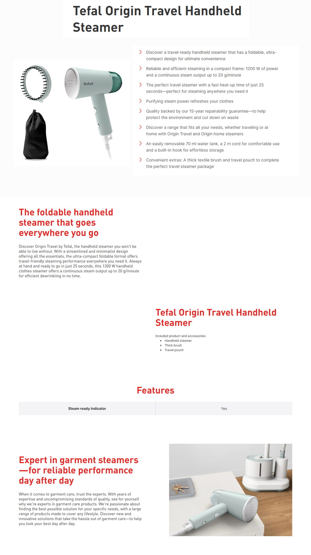 Tefal 1200W Origin Travel Handheld Foldable Garment Steamer DT1034 | 35 seconds to complete heating | Steam output up to 20 g/minute