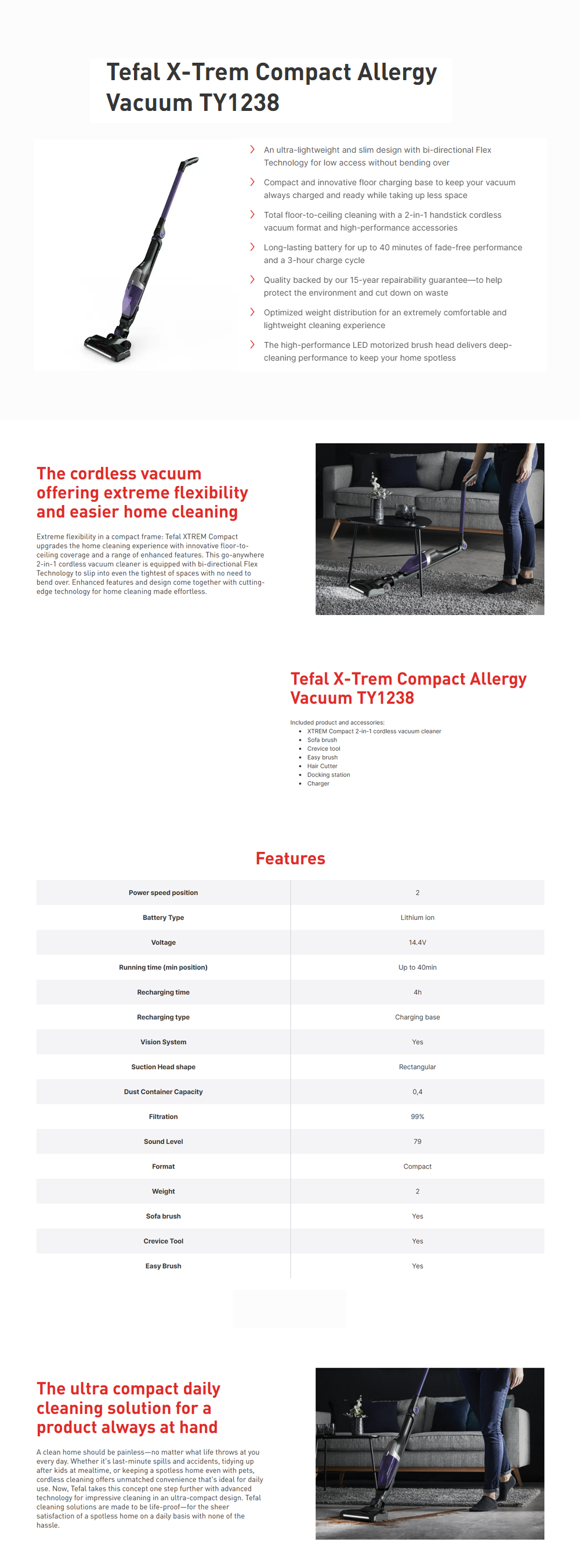 Tefal 145W XTREM Compact 2-in-1 Cordless Vacuum Cleaner Stick TY1238 | Bi-directional Flex Technology | 0.4 L (max)