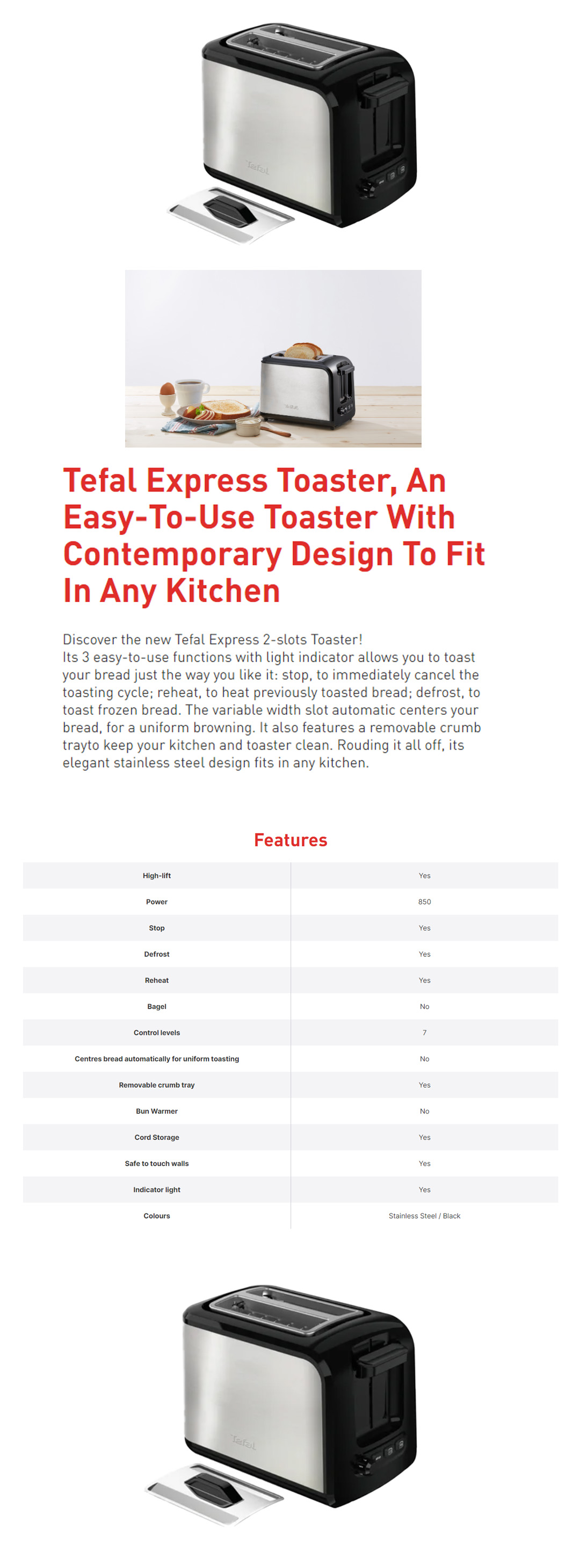 Tefal 2 Slices Express Toaster TT410D | 7 Browning Levels | Removable Crumb Tray | Indicator Light | Defrost | Reheat | Toaster with 2 Year Warranty