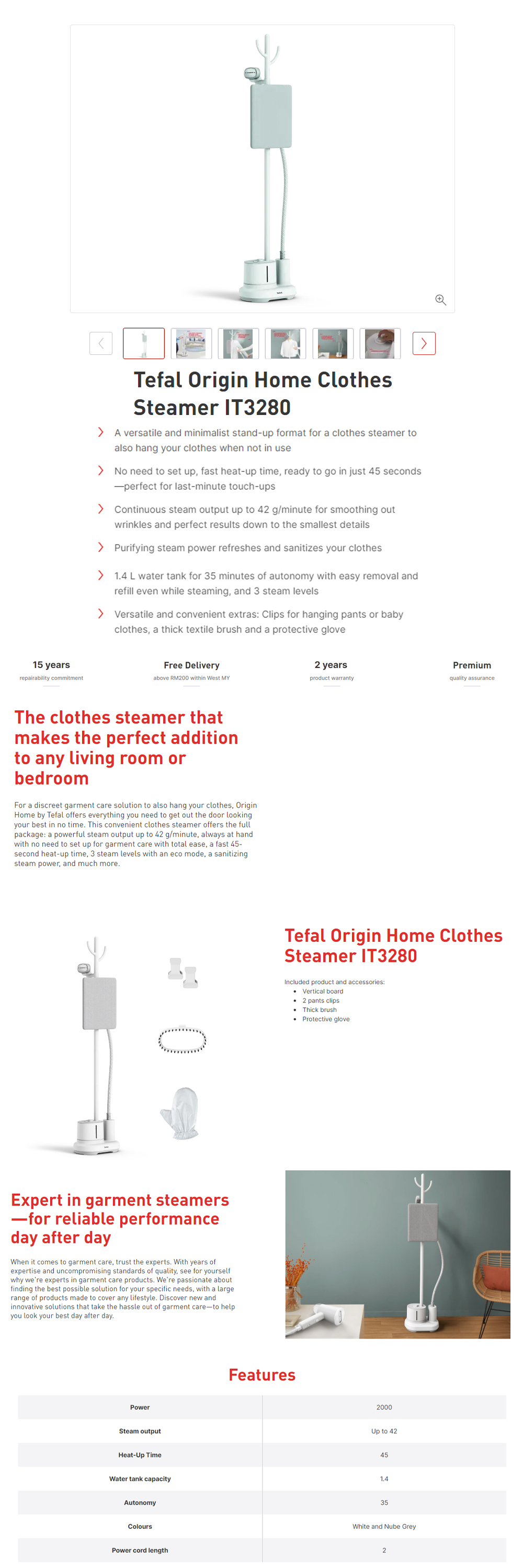 Tefal 2000W Origin Home Clothes Steamer IT3280 | 3 Steam Levels | 1.4L Water Tank | 45 Seconds To Complete Heating