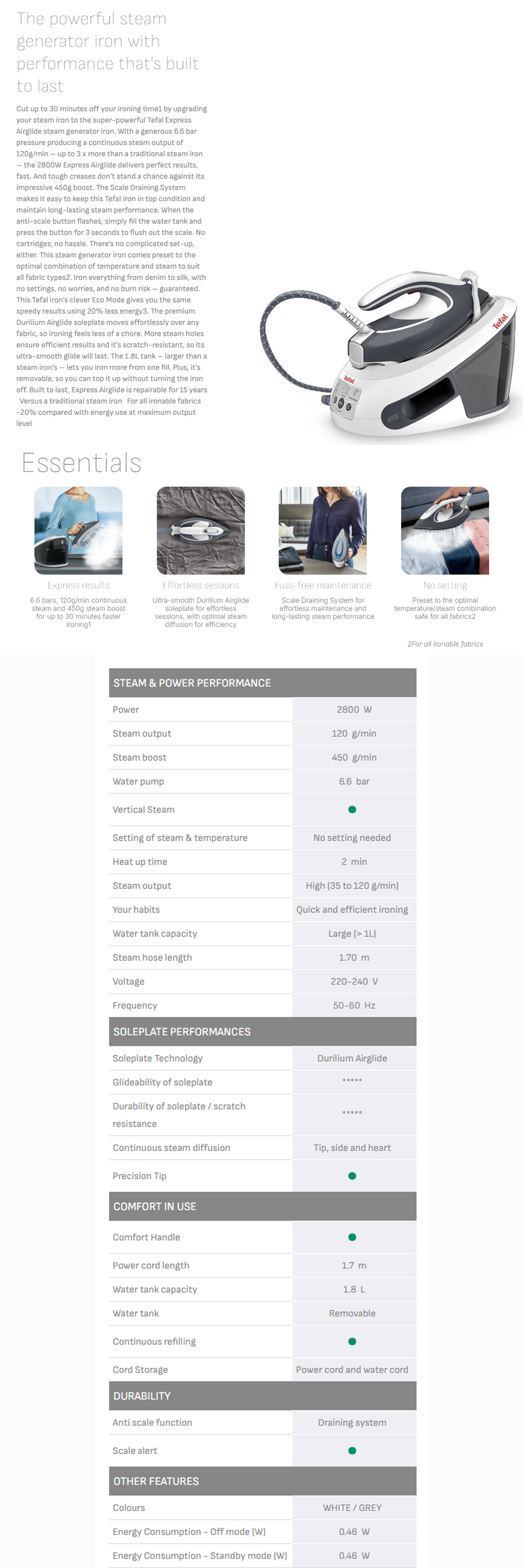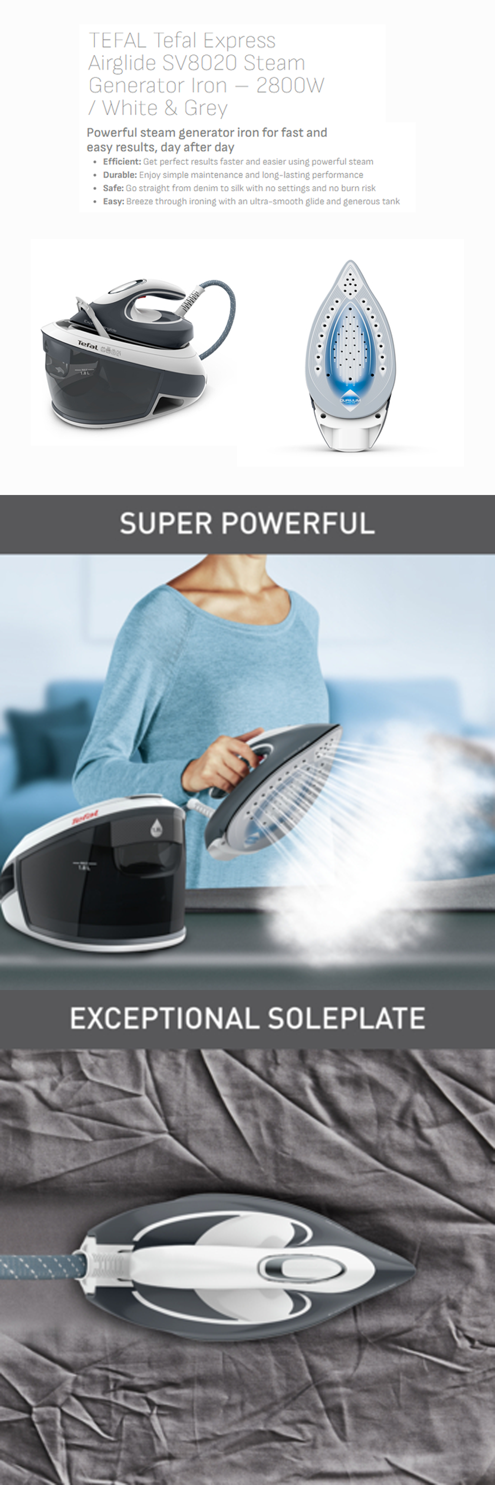 Tefal 2800W Express Airglide Steam Generator Iron SV8020 | Eco mode | Extra-powerful | Ultra-Smooth Durilium Airglide