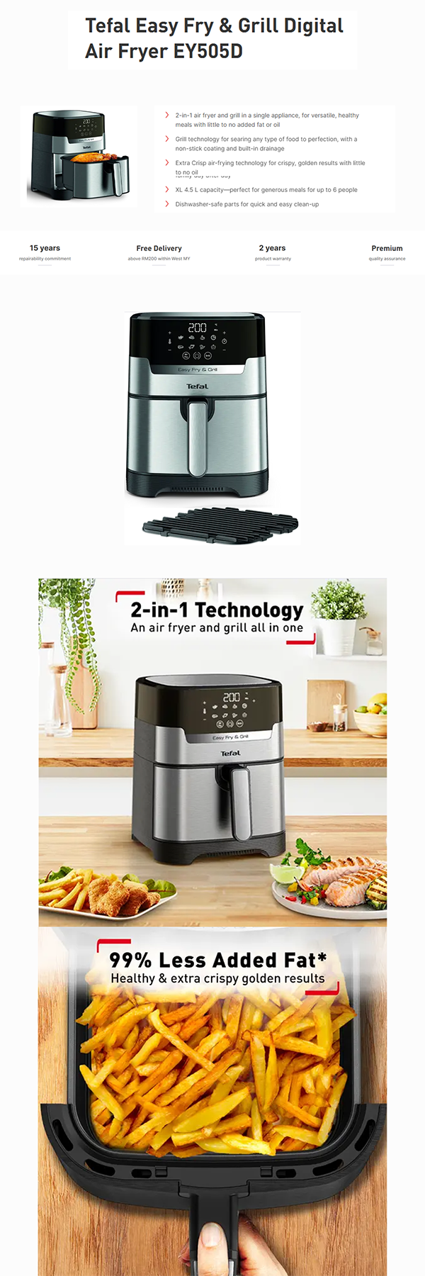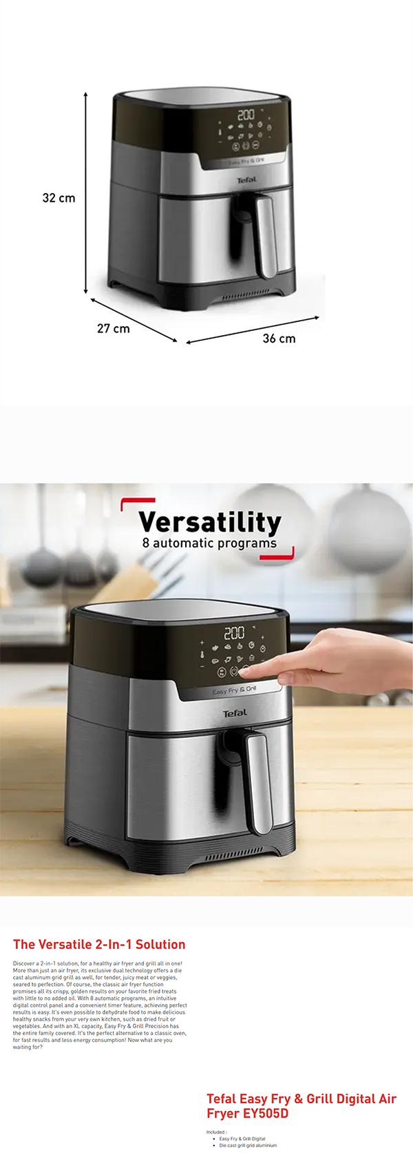 Tefal 4.5L Easy Fry & Grill Digital Air Fryer EY505D | 2-in-1 air fryer | Grill technology | Extra Crisp air-frying | Precision touchscreen