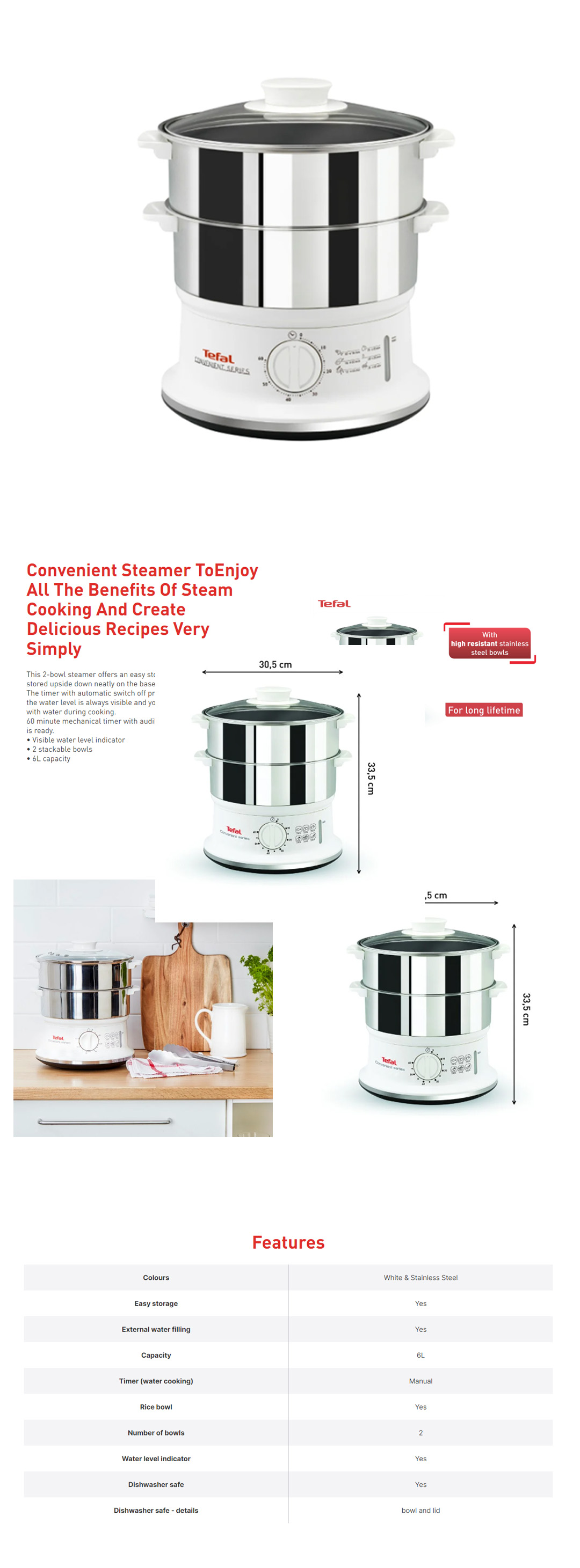 Tefal 6L Stainless Steel Convenient Steamer VC1451 | Easy Storage | External Water Filling | Water Level Indicator | Steamer with 2 Year Warranty