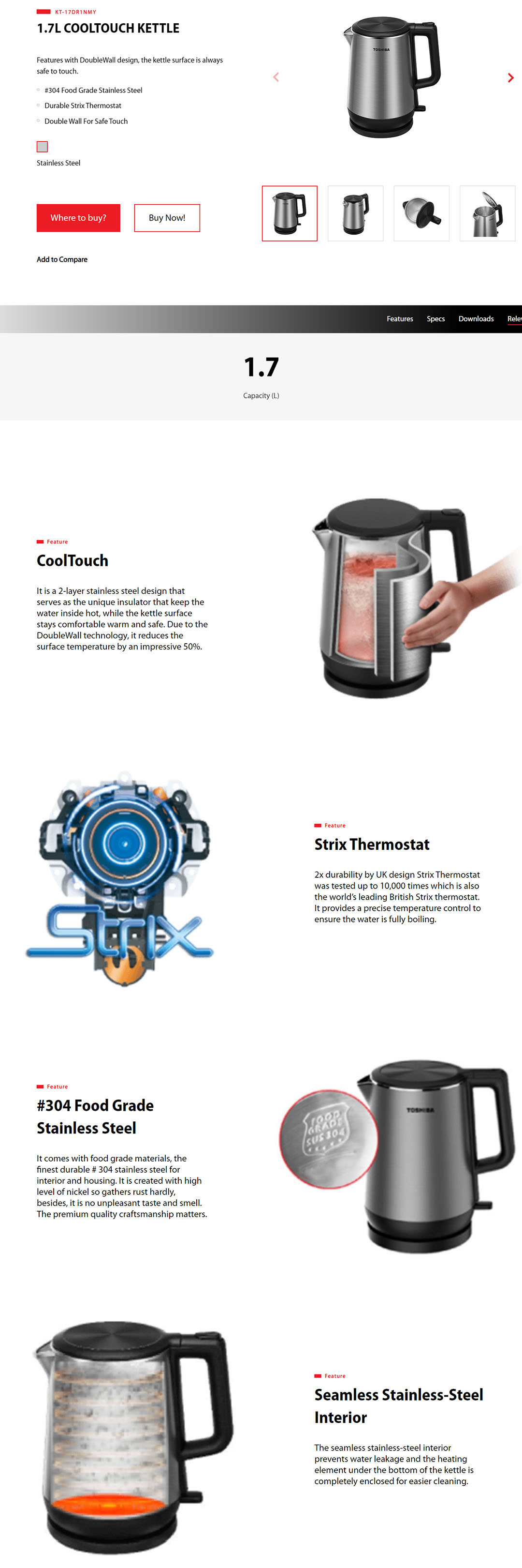 TOSHIBA 1.7L Kettle KT-17DR1NMY | Stainless Steel | CoolTouch | Auto Shut-off Protection | Concealed Heating Element | Kettle with 1 Year Warranty