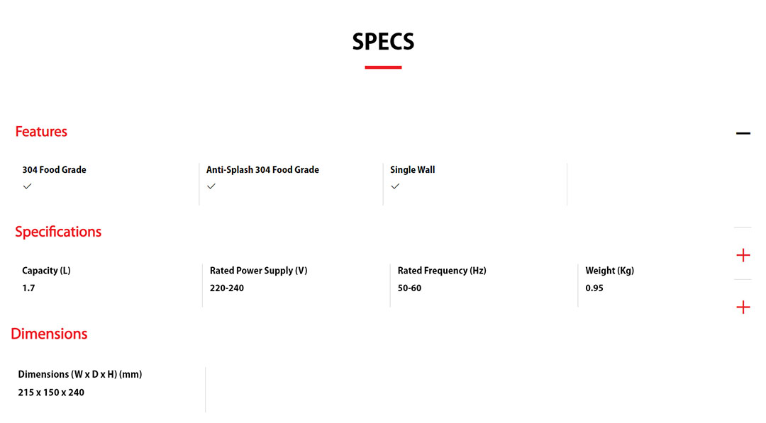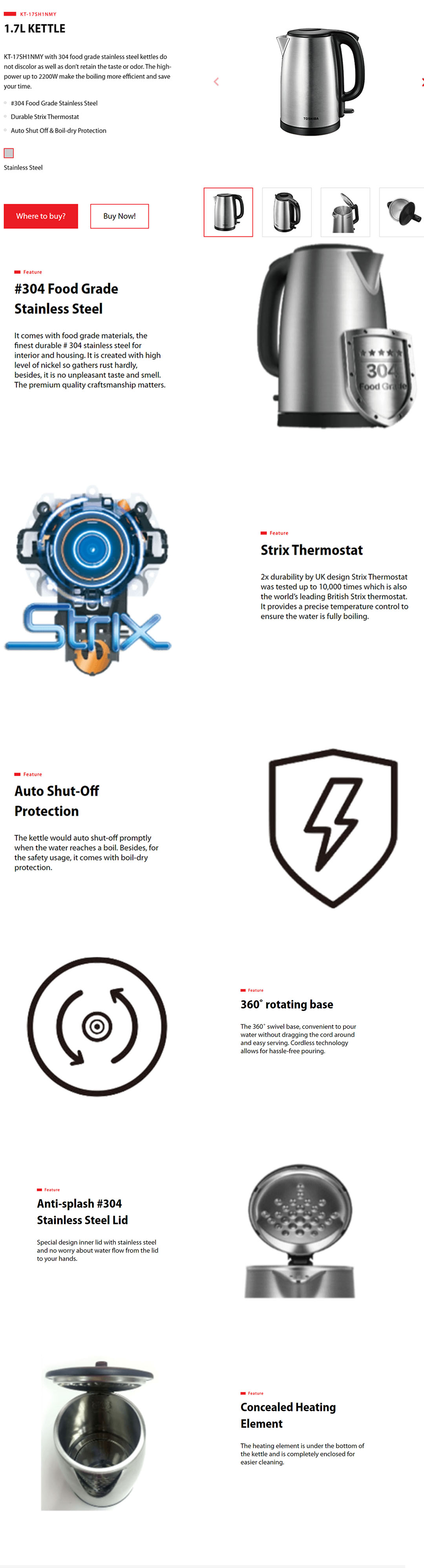 ● 304 Food Grade Stainless Steel ● Strix Thermostat ● Auto Shut-Off Protection ● Concealed Heating Element