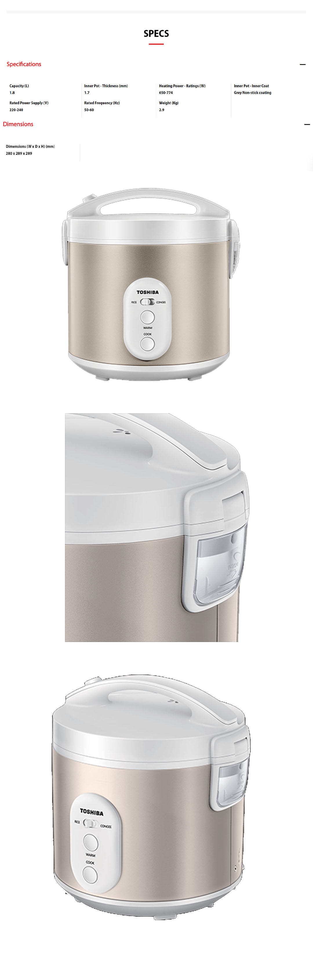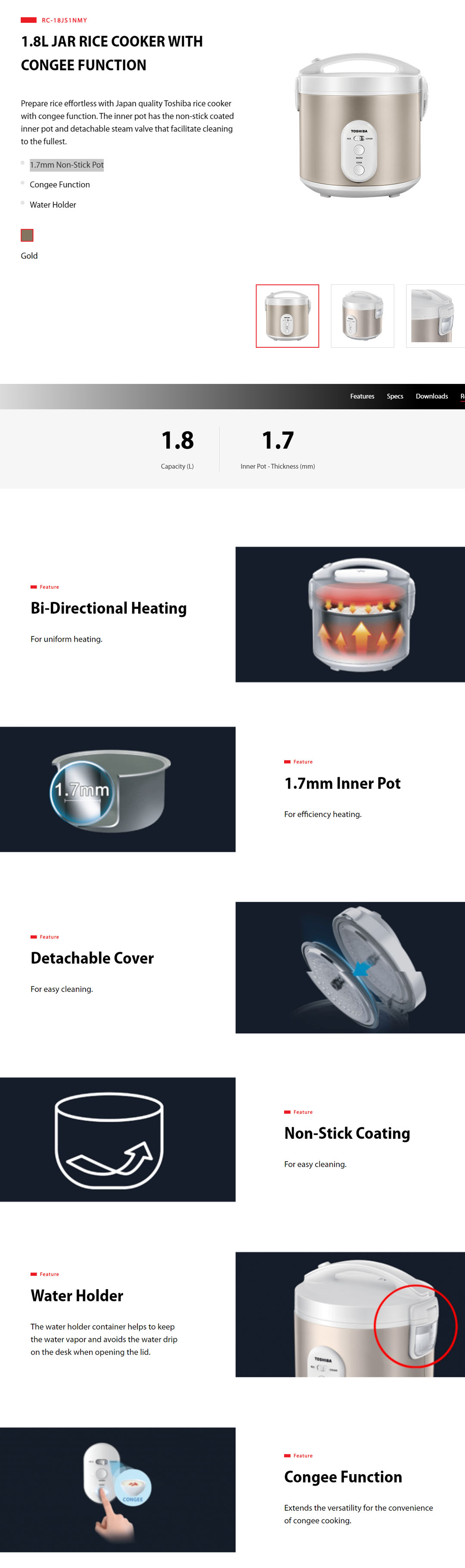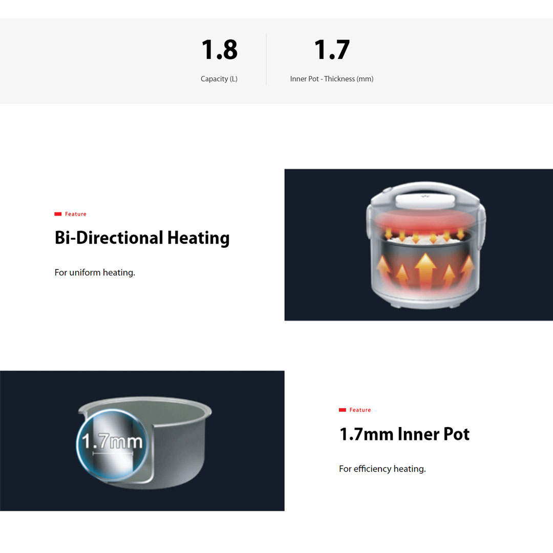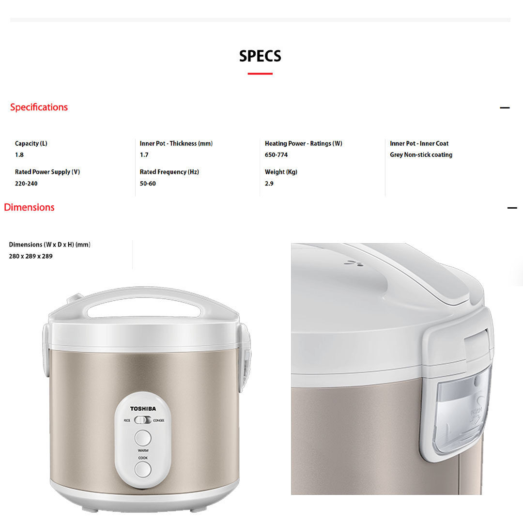 TOSHIBA 1.8L Jar Rice Cooker RC-18JS1NMY | 1.7mm Inner Pot | Non-Stick Coating | Rice Cooker with 1 Year Warranty