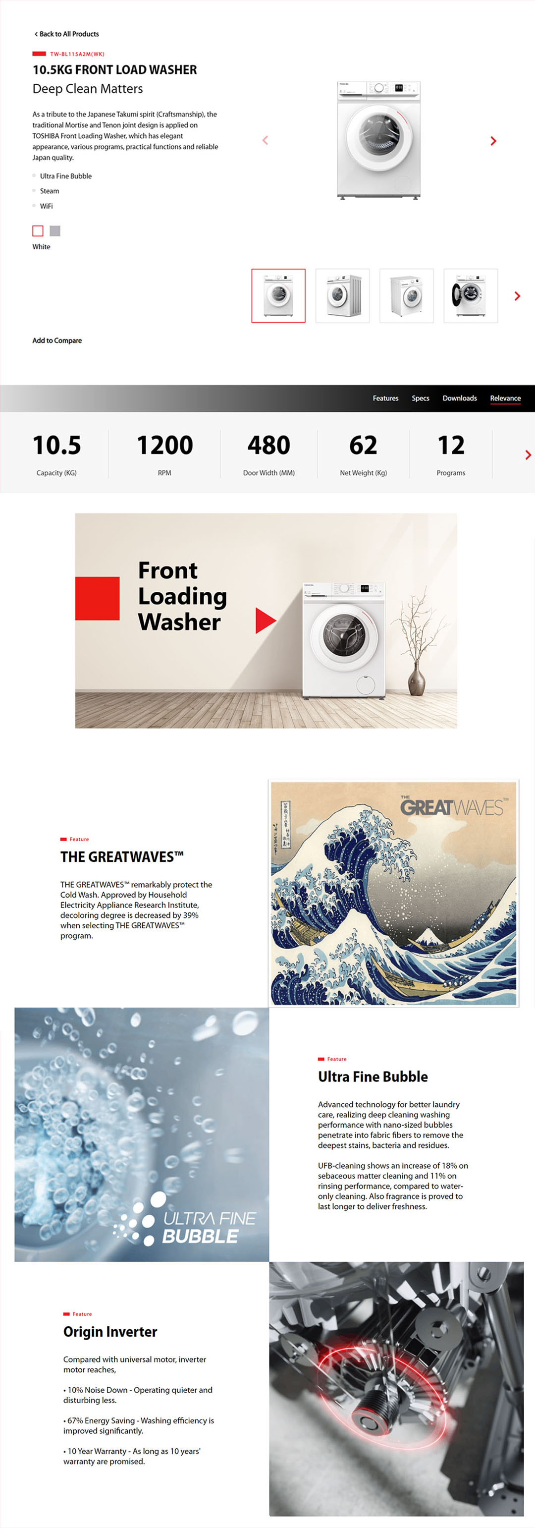 TOSHIBA 10.5KG Front Load Inverter Washing Machine TW-BL115A2M(WK) | The Greatwaves | Ultra Fine Bubble | Steam Wash | Drum Clean | IOT TSmartLife App Control | Washing Machine with 2 Year General Warranty & 2 Year Panel Warranty & 10 Year Motor Warranty