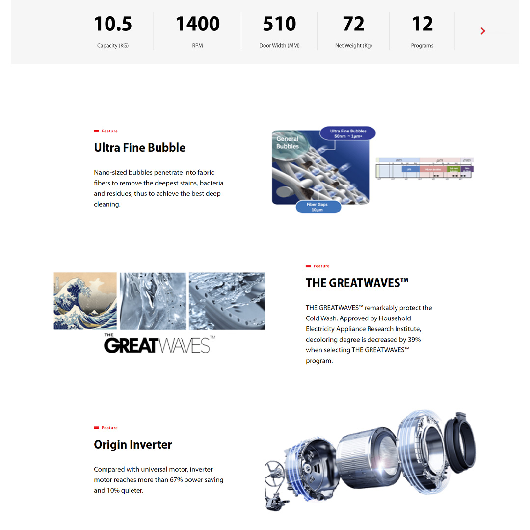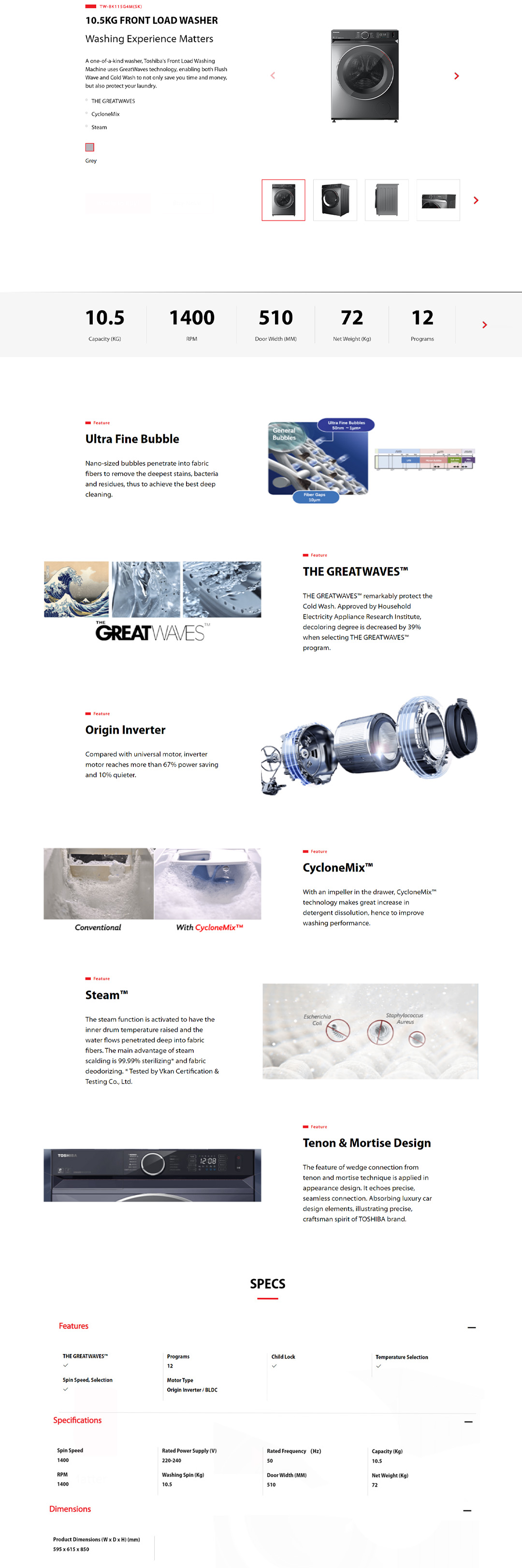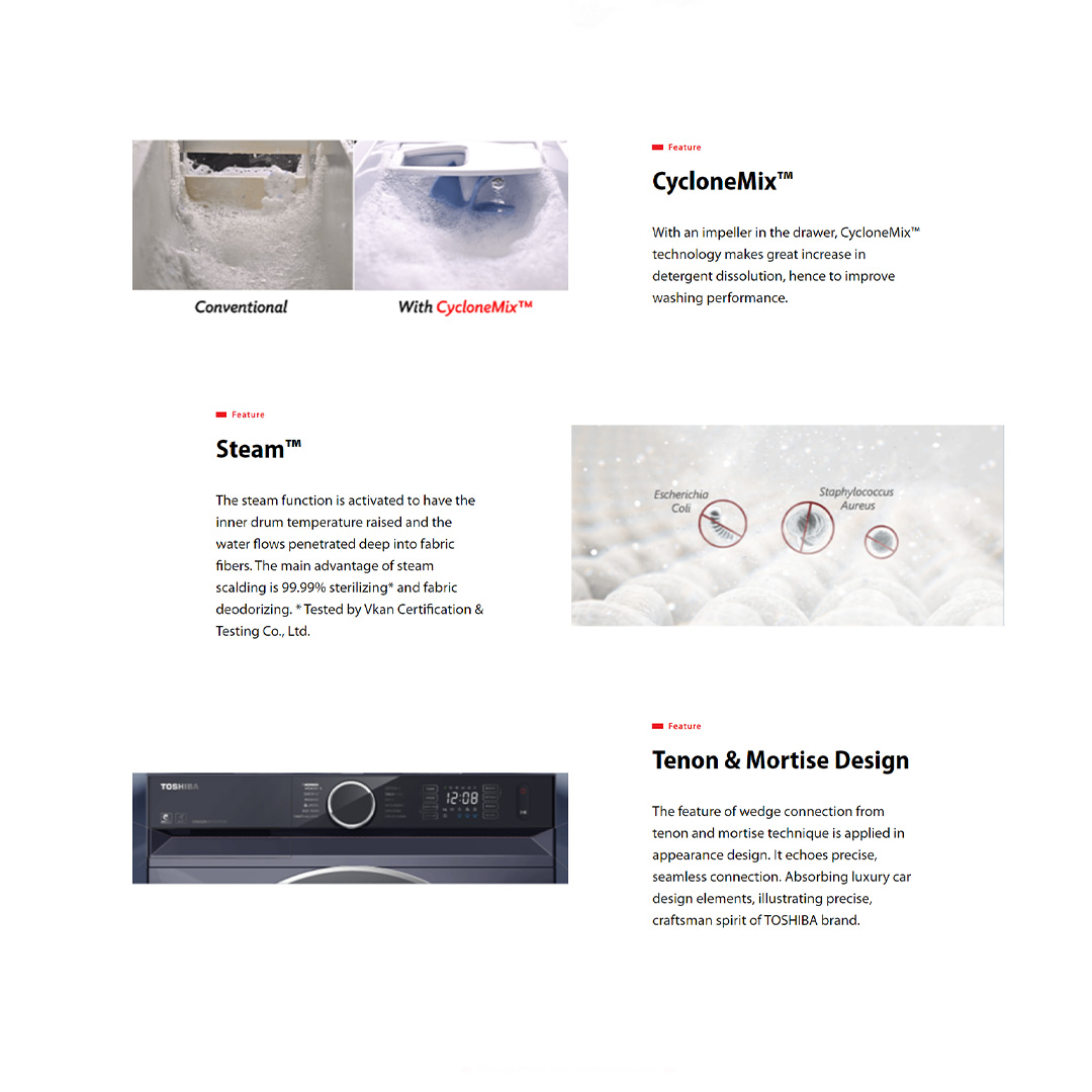 Toshiba 10.5KG Front Load Washer TW-BK115G4M(SK) | Ultra Fine Bubble | Origin Inverter | CycloneMix | Steam | Child Lock | Door Lock | 12 Programs | Washing Machine with 2 Year General & 10 Year Motor Warranty