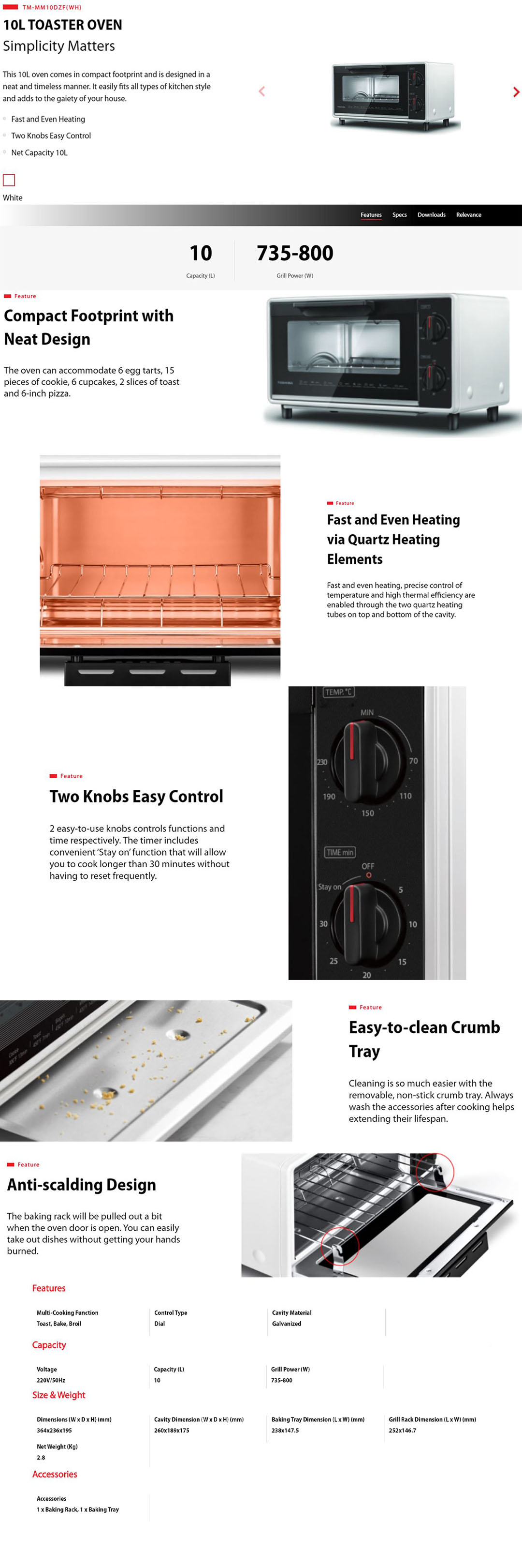 TOSHIBA 10L Toaster Oven TM-MM10DZF(WH) | Compact Footprint with Neat Design | Fast and Even Heating via Quartz Heating Elements | Two Knobs Easy Control | Easy-to-clean Crumb Tray | Anti-scalding Design | Toaster Oven with 1 Year General Warranty