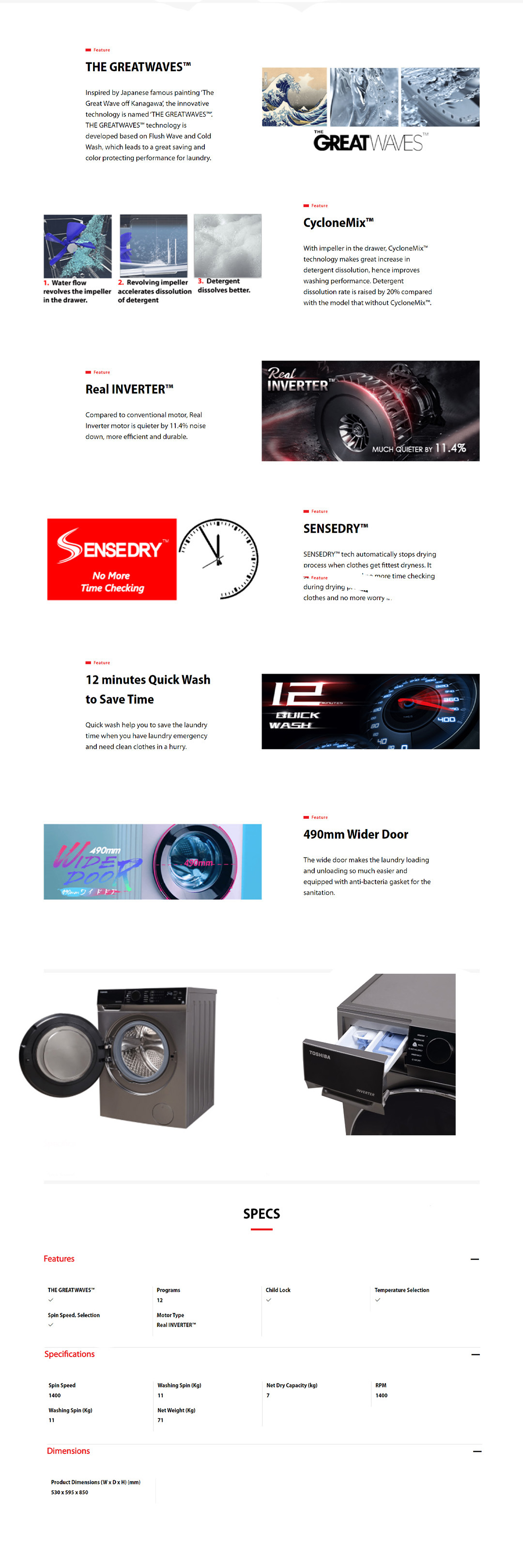 TOSHIBA 11KG/7KG Front Load THE GREATWAVES Real Inverter Washer Dryer TWD-BJ120M4M(SK) | 12 Programs | Child Lock | Temperature Selection | Washer Dryer with 2 Years Warranty