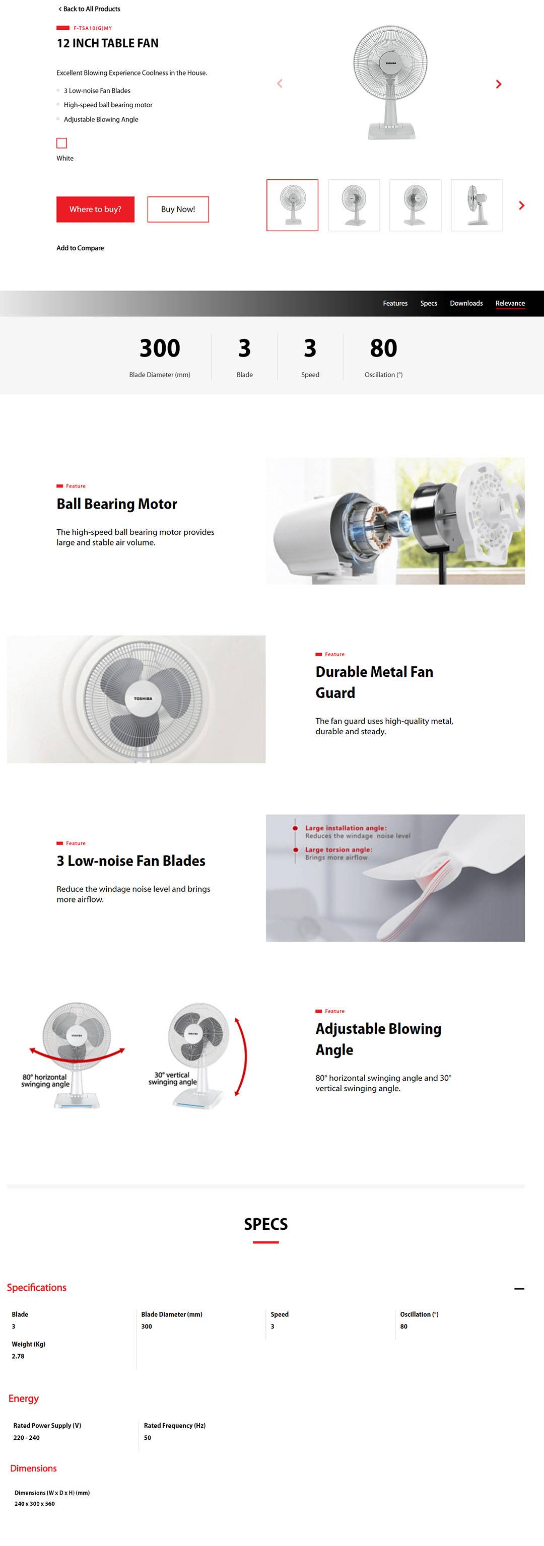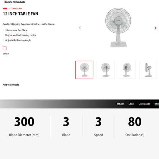 TOSHIBA 12" Table Fan F-TSA10(G)MY | 3 Low-noise Fan Blades | Ball Bearing Motor | Table Fan with 1 Year Warranty