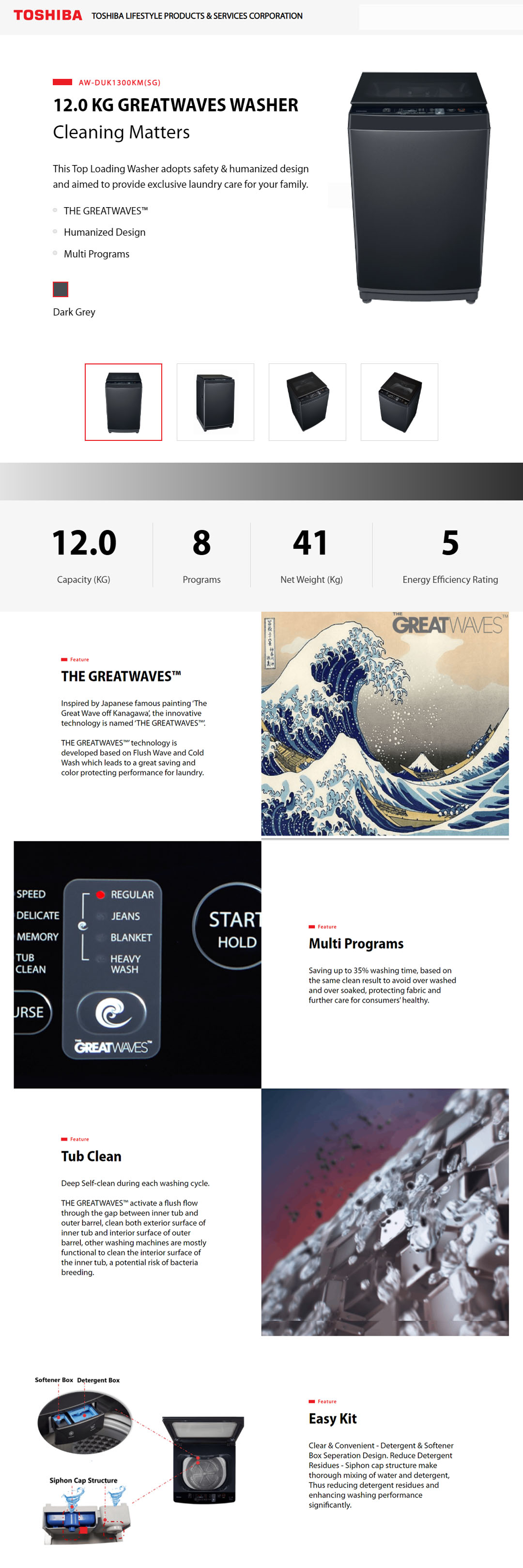 TOSHIBA 12KG Greatwaves Washer AW-DUK1300KM(SG) | Multi Programs | Tub Clean | Easy Kit | No Angular Design | Damping Lid | Child Lock | Heavy Wash | I Clean | Easy Kit | Washing Machine with 2 Year General & 3 Year Panel & 13 Year Motor Warranty