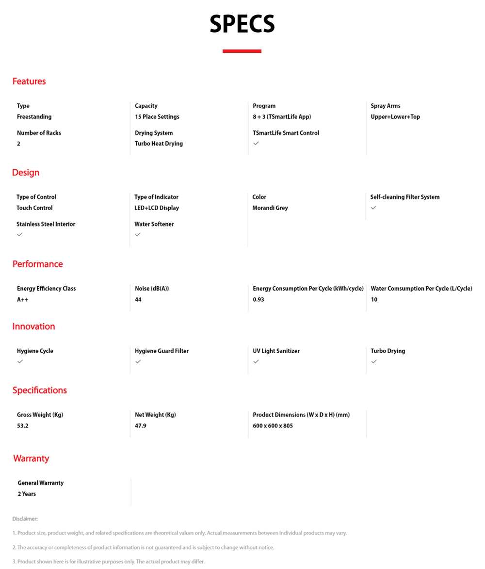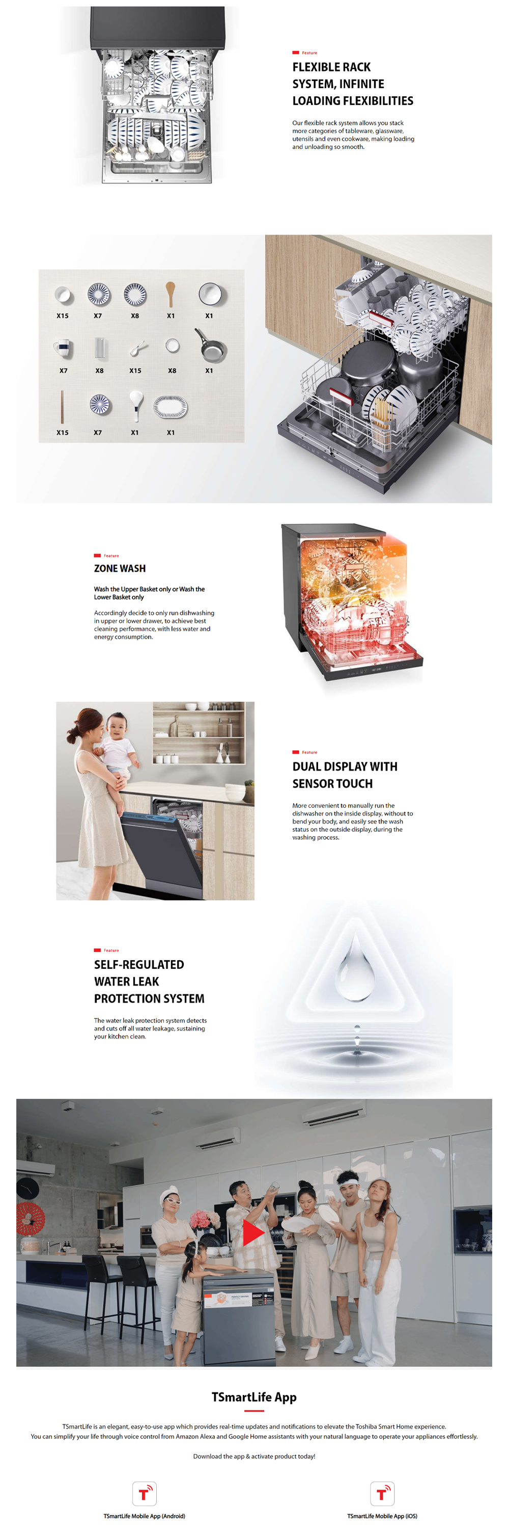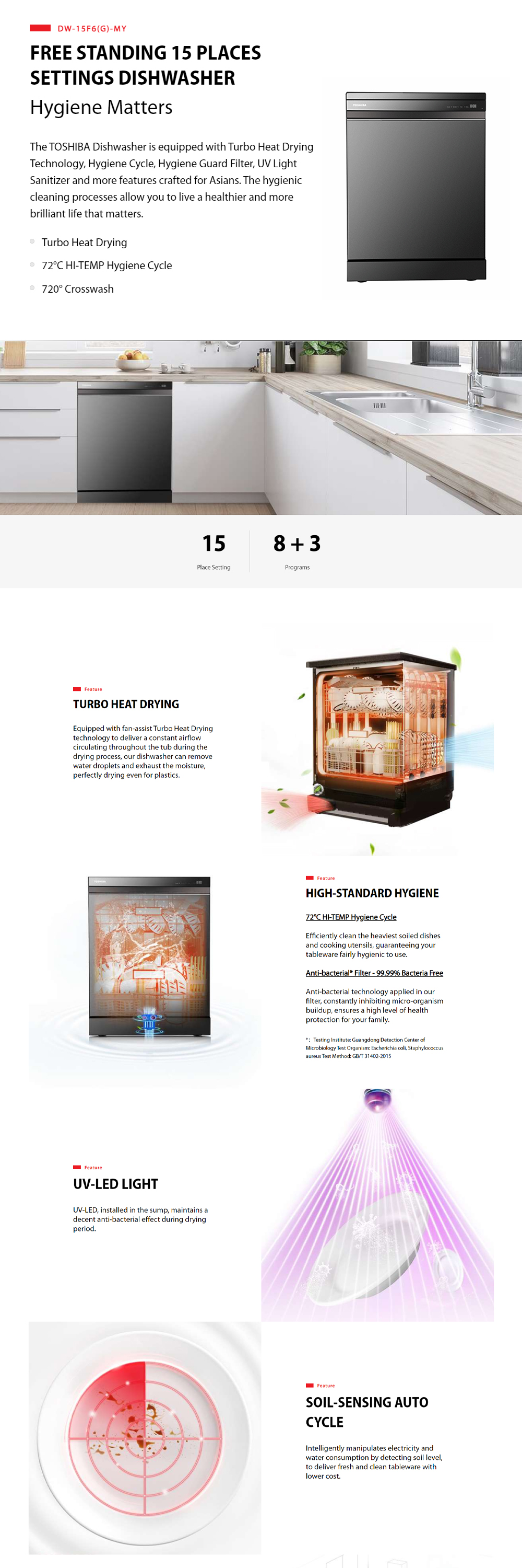 TOSHIBA 15 Place Setting Free Standing Dishwasher DW-15F6(G)-MY | Sliding Tray | 8 Program | Dual Wash Zone