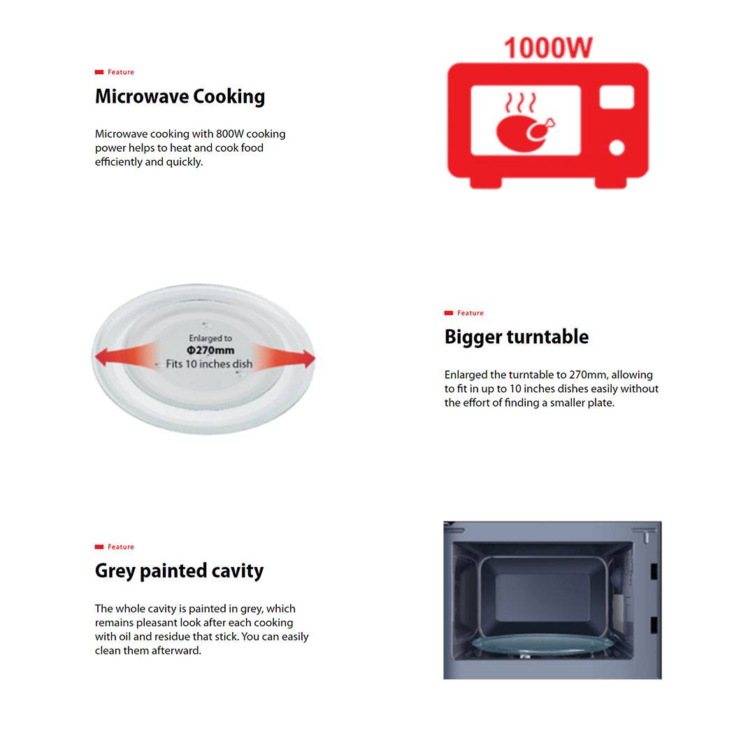 ● Bigger turntable ● Grey painted cavity ● Defrost by Time ● Slip-proof Oven feet