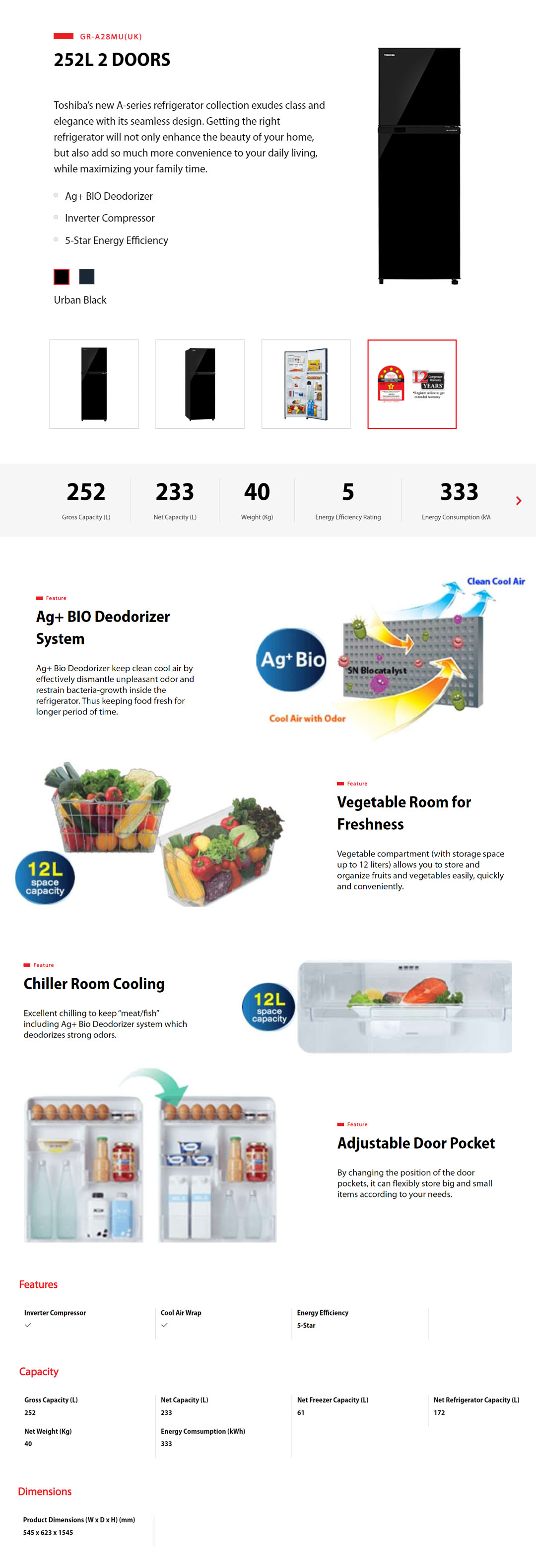 TOSHIBA 252L 2 Doors Inverter Refrigerator GR-A28MU(UK) | Cool Air Wrap | Ag+ BIO Deodorizer | Adjustable Door Pocket | Refrigerator with 1 Year Warranty